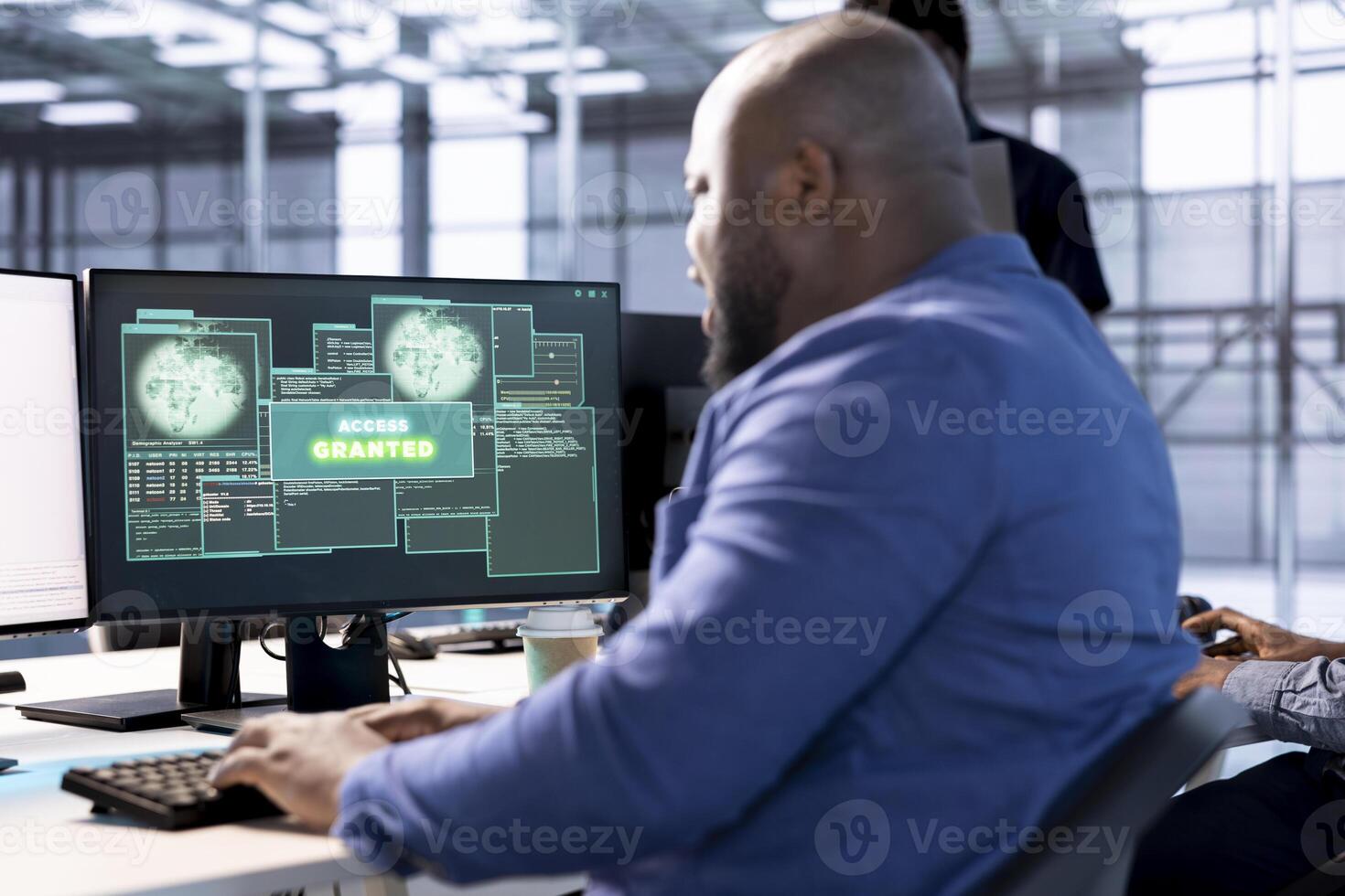 Access granted notification on monitor received by man reconfiguring server hub, optimizing it. African american data center IT expert using PC to successfully eliminate all errors Pro Photo