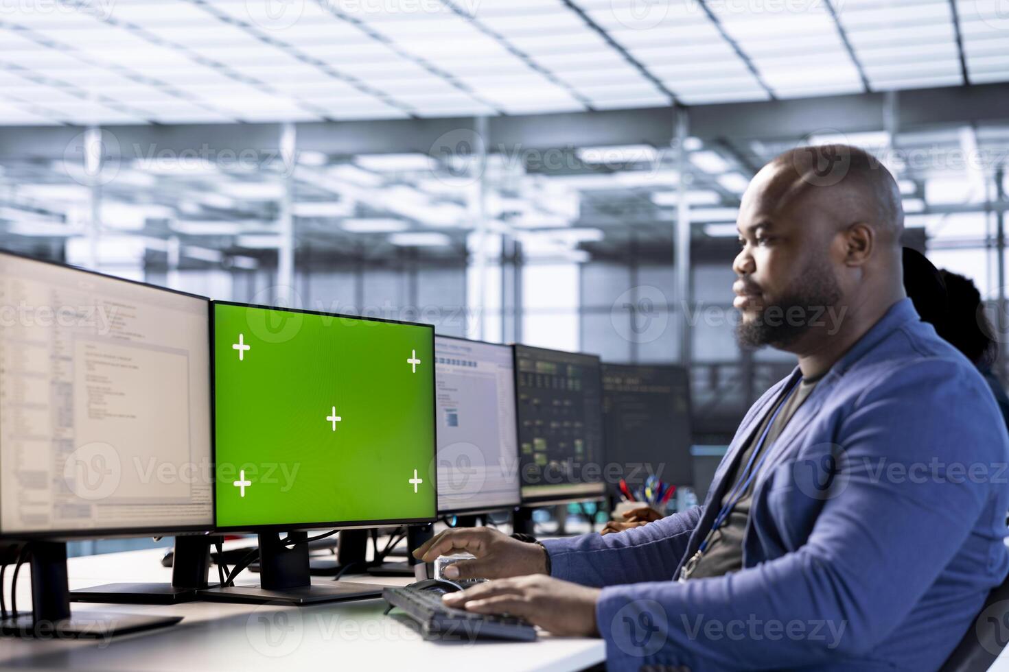Engineer in server hub using green screen computer to find firewall misconfigurations affecting performance. Man checking systems bottlenecks leading to sluggish data transfer rates using mockup PC Pro Photo