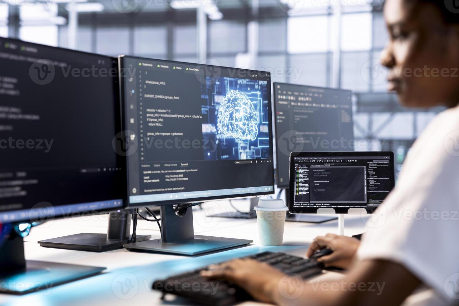 Admin in server farm using artificial intelligence technology for increased productivity in startup company. Machine learning expert in data center implementing AI driven solutions Pro Photo