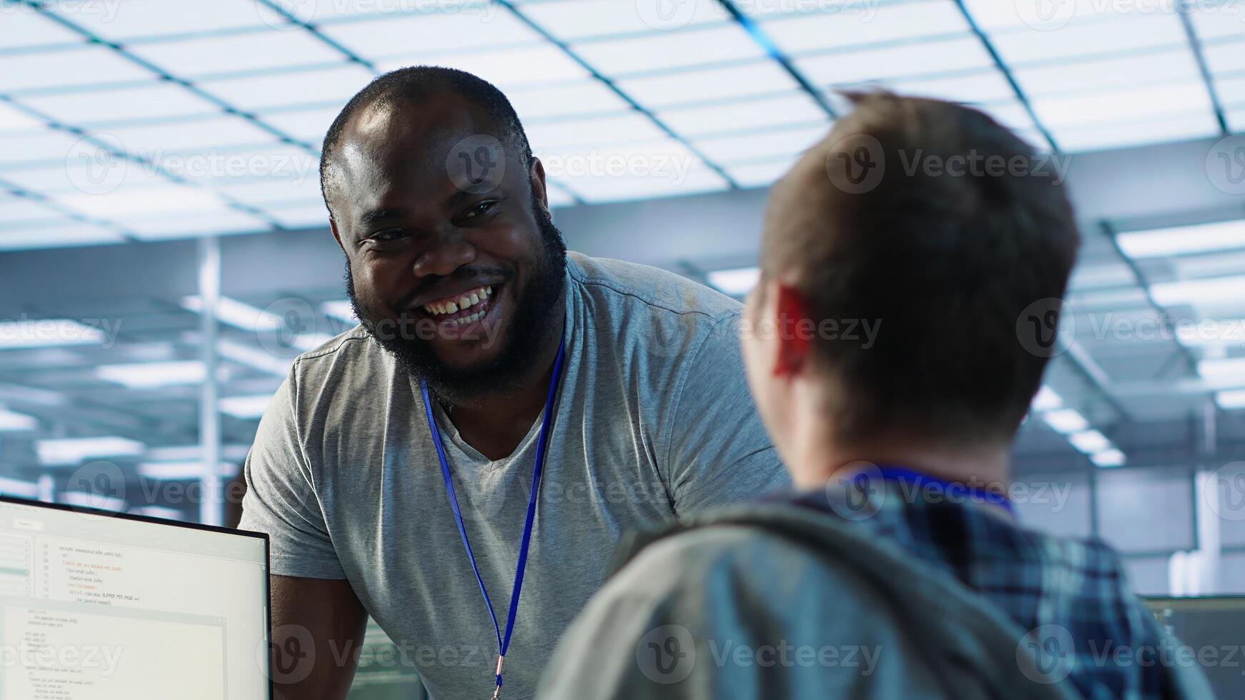 Engineer having fun with colleague at work in data center establishment, making jokes. Team of technicians making each other laugh, bonding in server room, doing fist bump gesture , camera A Pro Photo