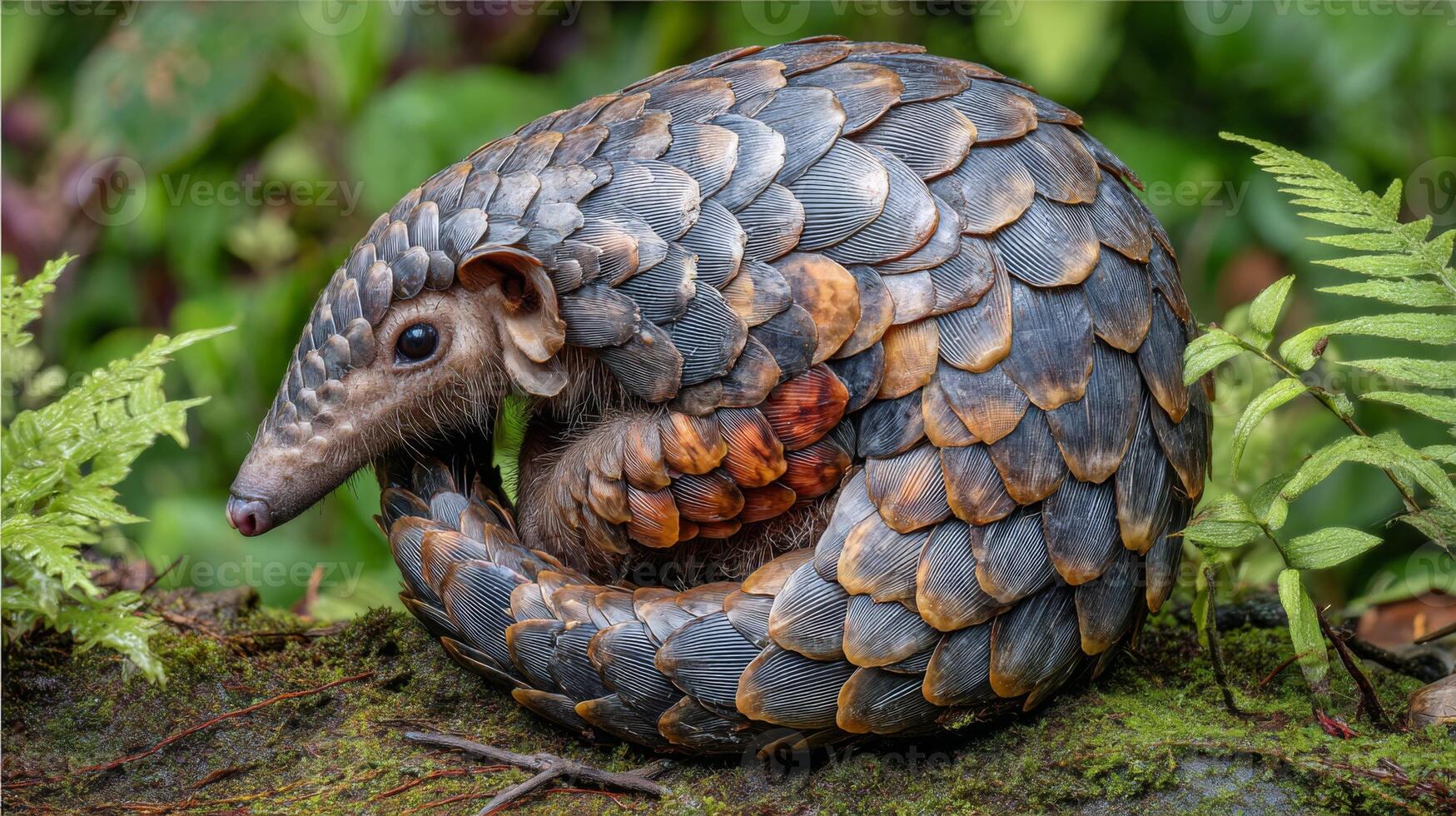 Close-up of Unique Pangolin Curled Into a Ball Surrounded by Lush Greenery with Intricate Scale Patterns in Nature Pro Photo
