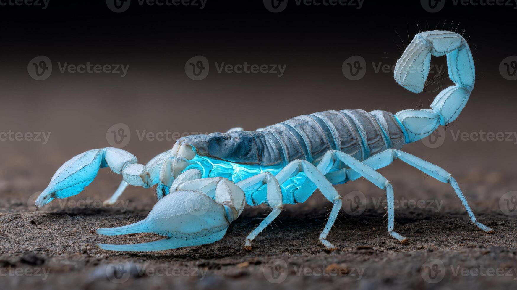 Close-Up Image of a Glowing Blue Scorpion in Dark Environment, Showcasing Its Unique Features and Intricate Details Pro Photo