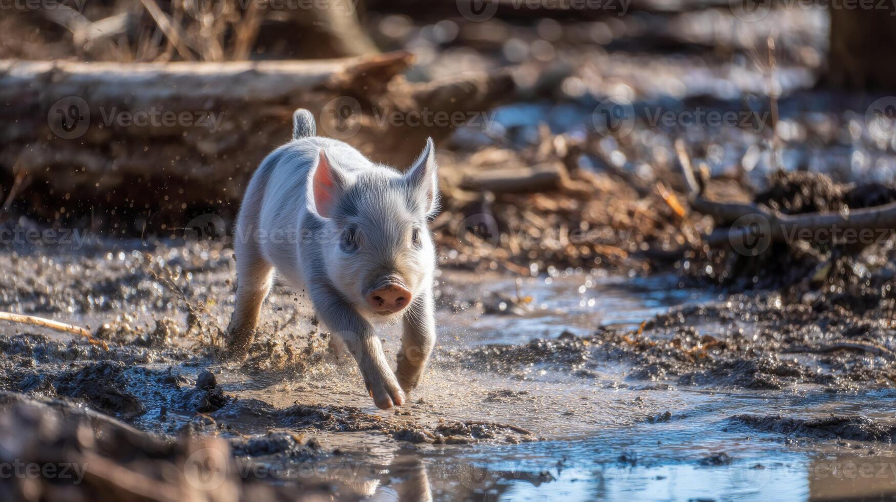Playful Piglet Running Through Muddy Water in a Rustic Environment Surrounded by Natural Elements and Sunlight Pro Photo
