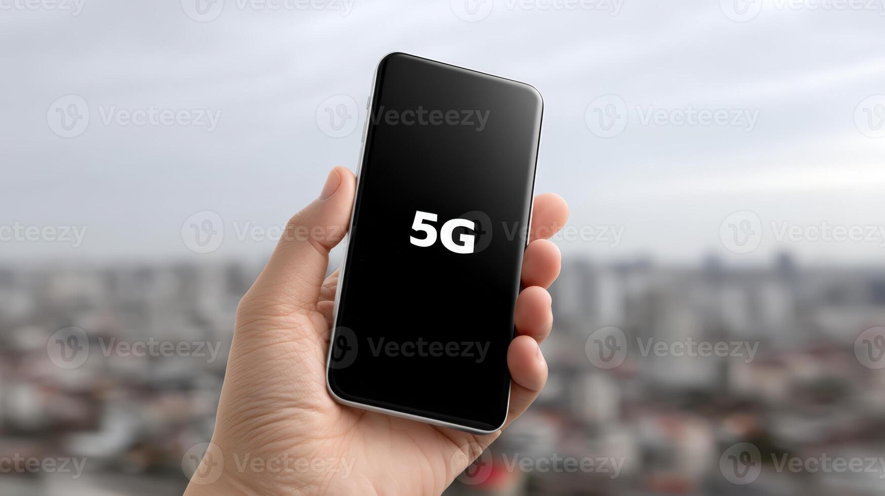 Smartphone displaying 5G network signal with city skyline in the background during overcast weather Pro Photo