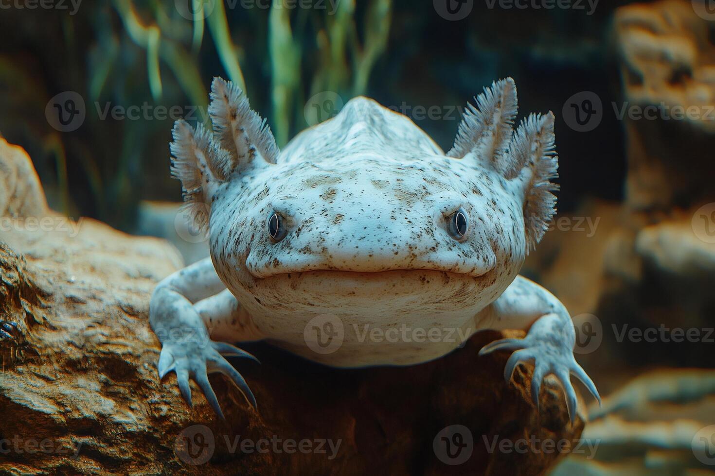 Axolotl resting on a rock in an underwater environment, displaying its unique feathery gills Pro Photo