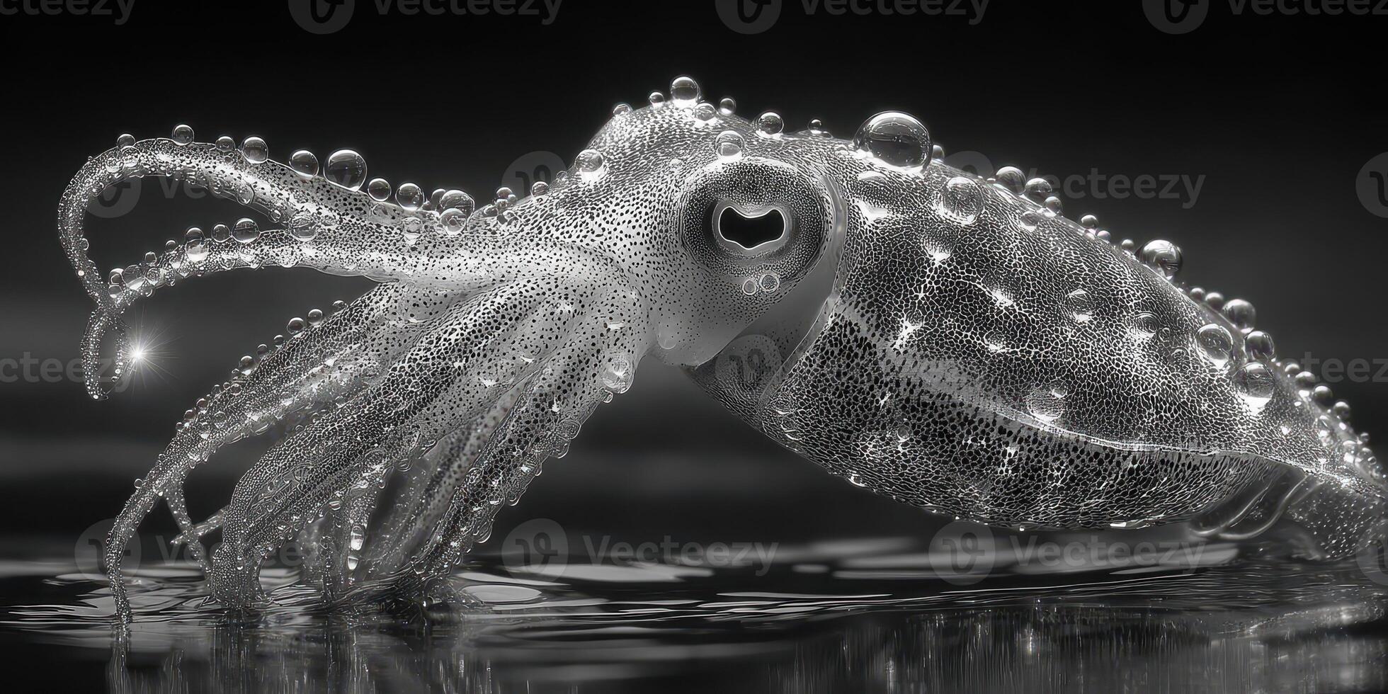 Unique underwater shot of a squid gliding through water and surrounded by bubbles in a tranquil setting Pro Photo