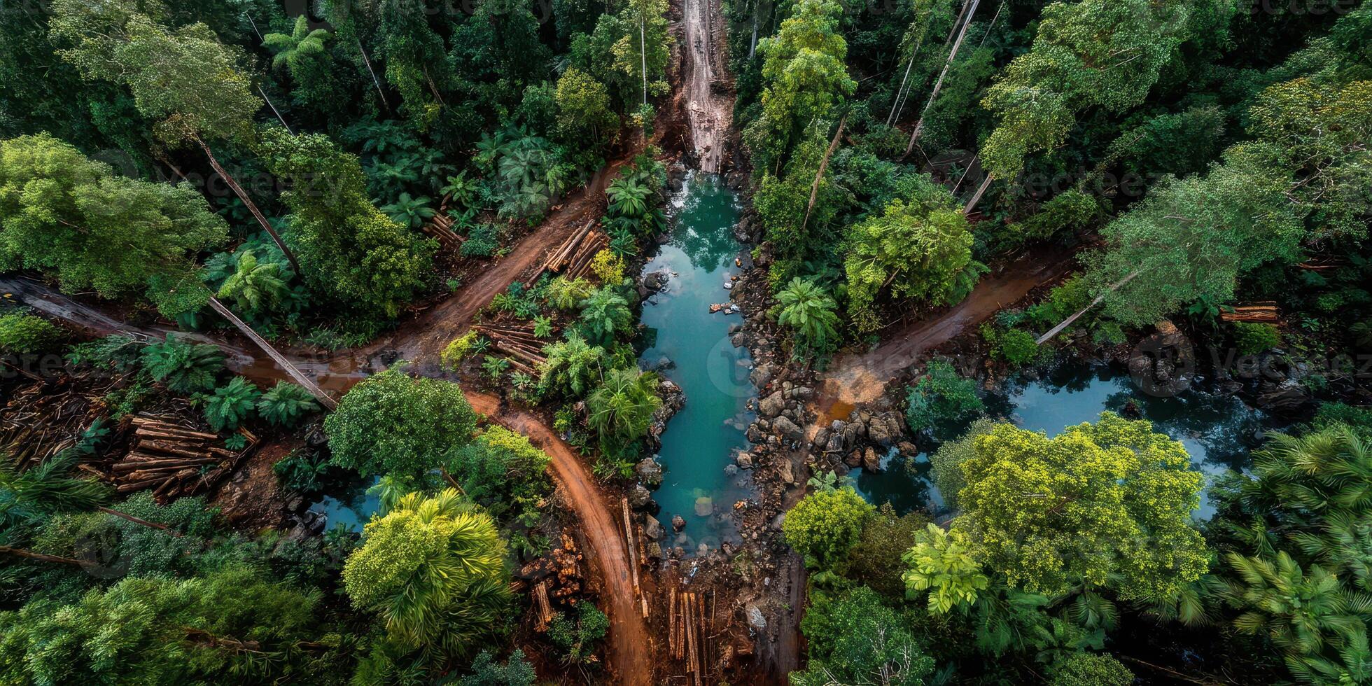 Lush green forest with winding river and logging paths captured from above during daylight hours Pro Photo