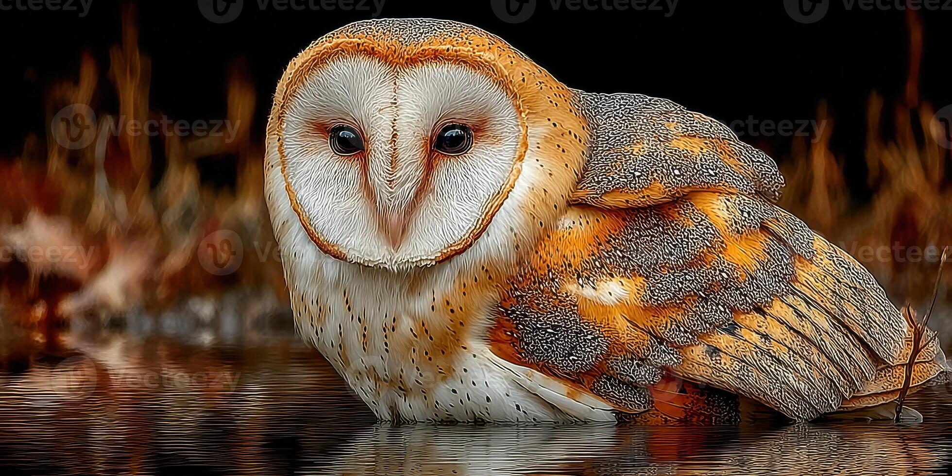 Barn owl perched calmly near the water during twilight, showcasing its distinct feather patterns and alert expression Pro Photo
