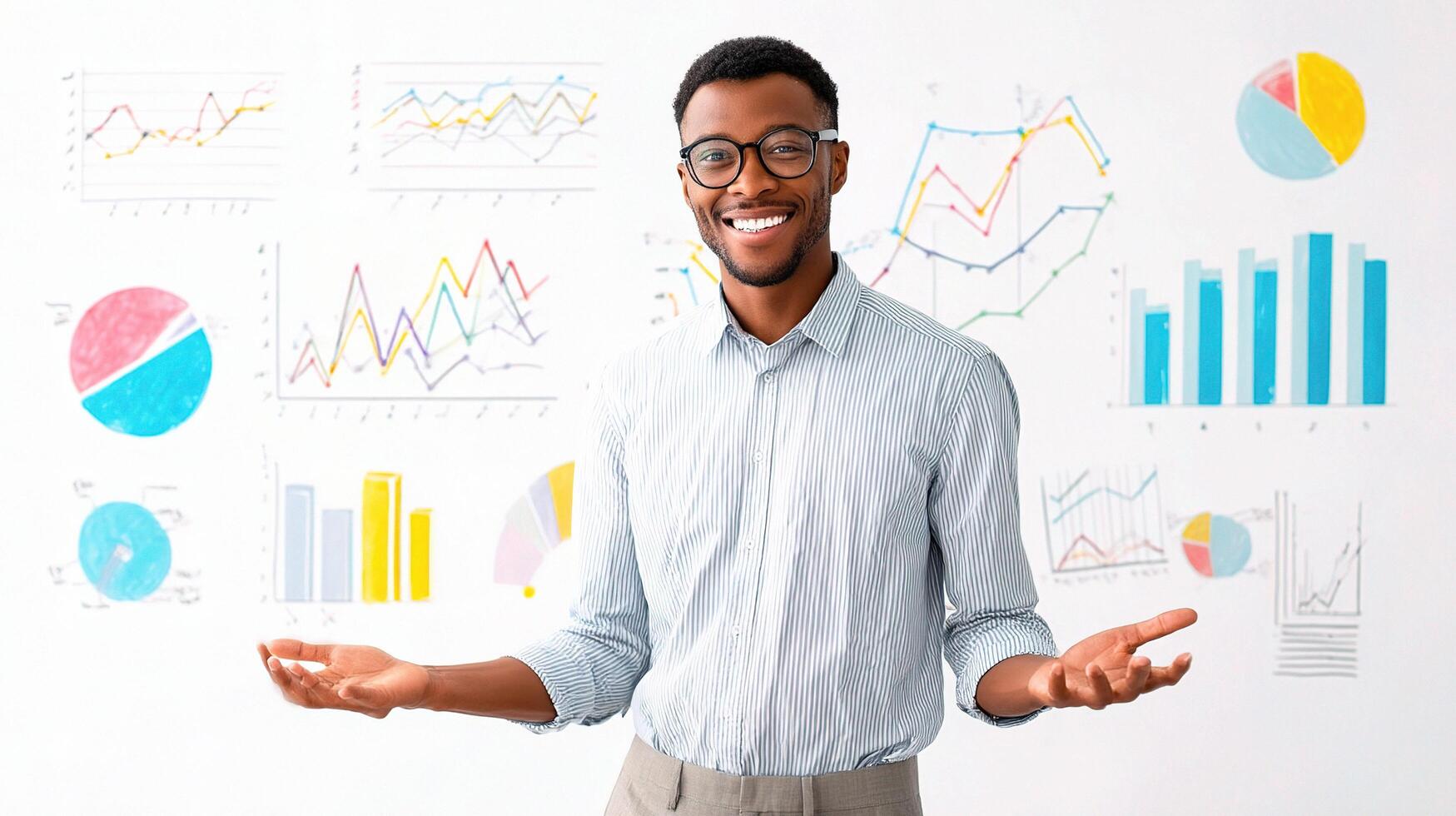 A man in glasses is standing in front of a white board with graphs and charts Free Photo