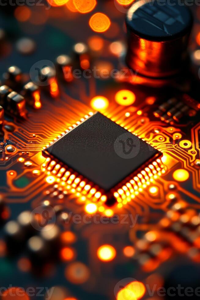Glowing processor chip surrounded by intricate circuitry on a board, showcasing technological innovation and design Pro Photo