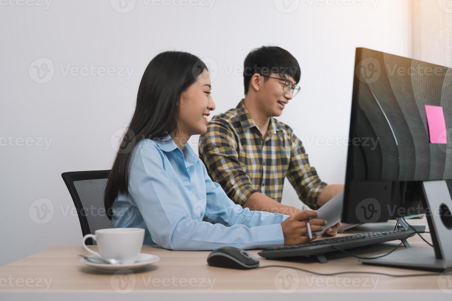 Young asian partner programmers working in team while making a new computer codes on desktop computer in the office. Pro Photo