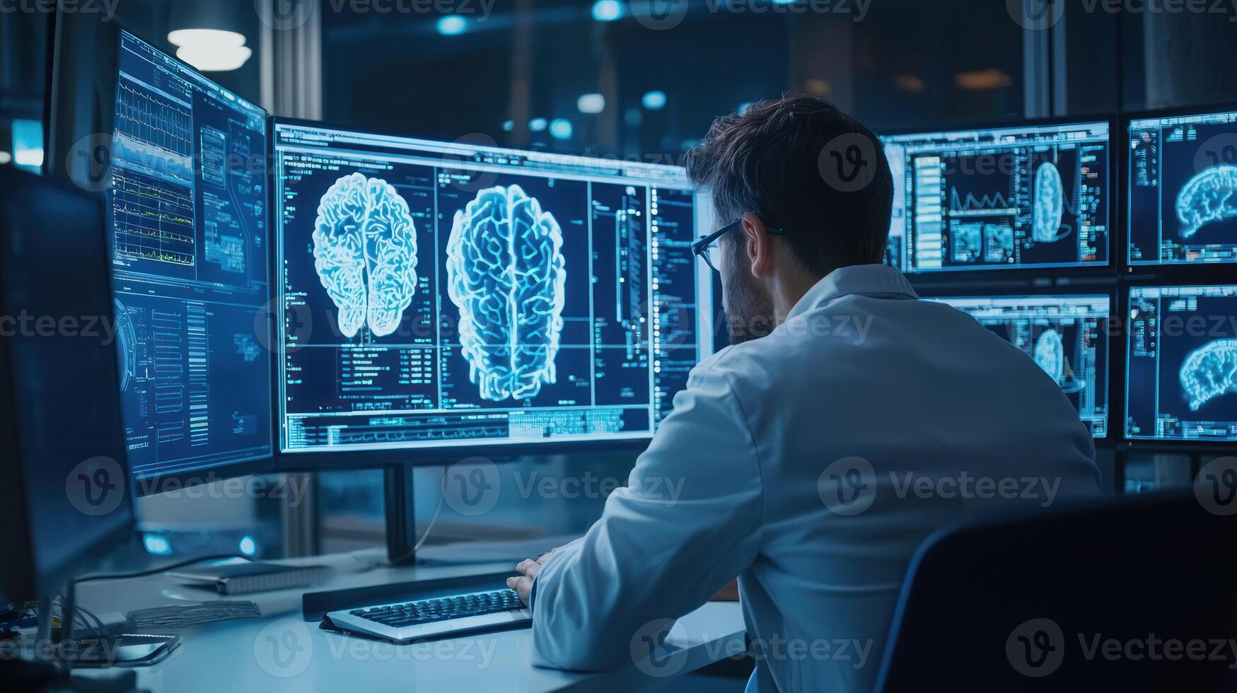 A man wearing a white lab coat, seated at a desk with multiple computer monitors displaying brain scans and medical data. Pro Photo