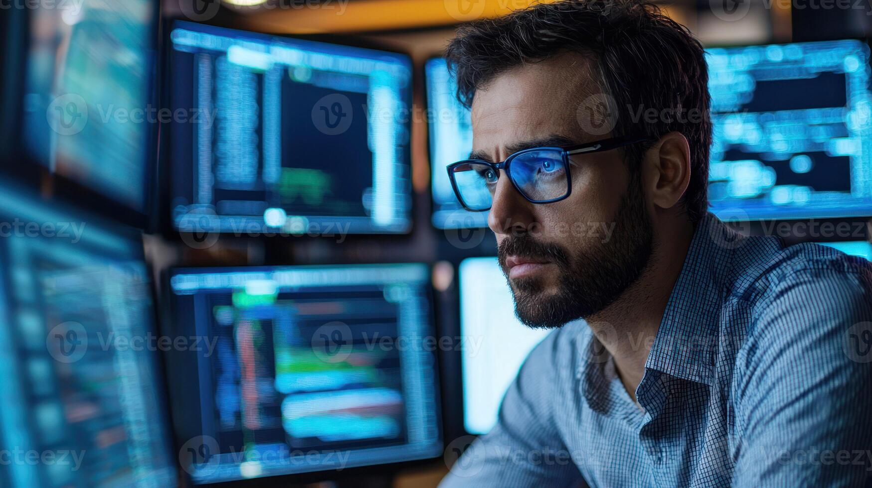 A man wearing glasses, sitting at a desk with multiple computer monitors in front of him, focused on coding or programming. Pro Photo