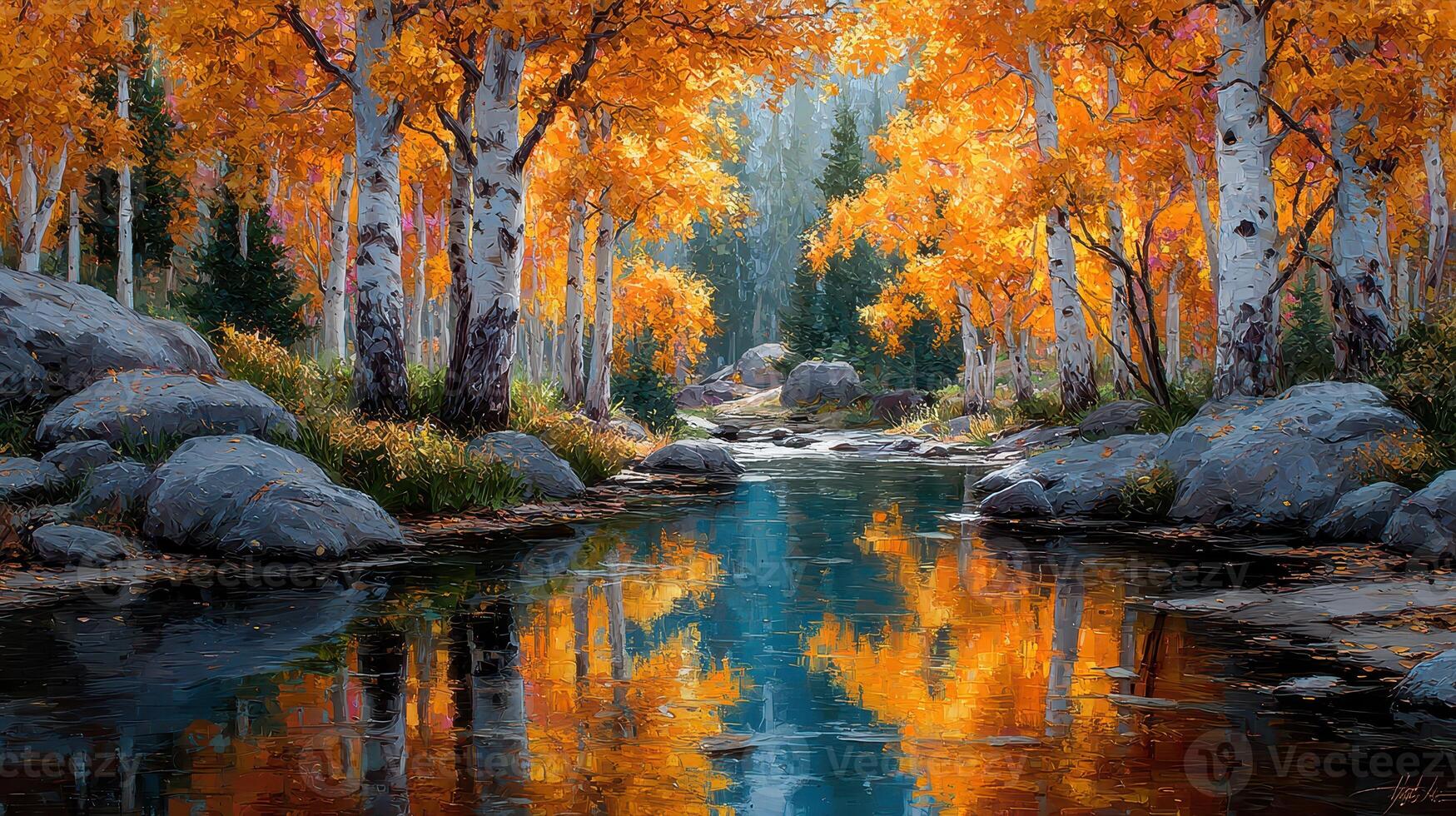 Autumn foliage reflects brilliantly in a serene stream surrounded by aspen trees in a tranquil forest setting Pro Photo