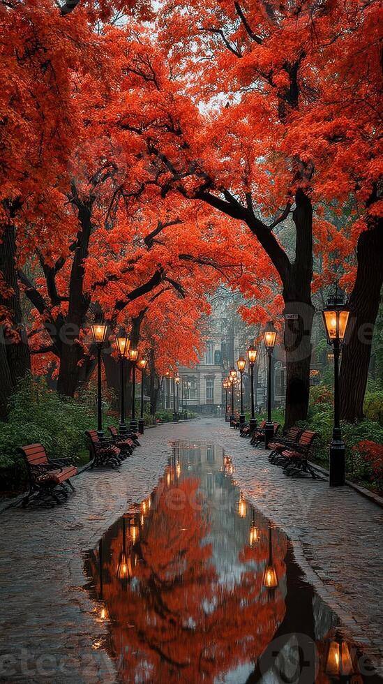 Autumn park path lined with glowing lanterns and vibrant red trees during a misty evening Pro Photo