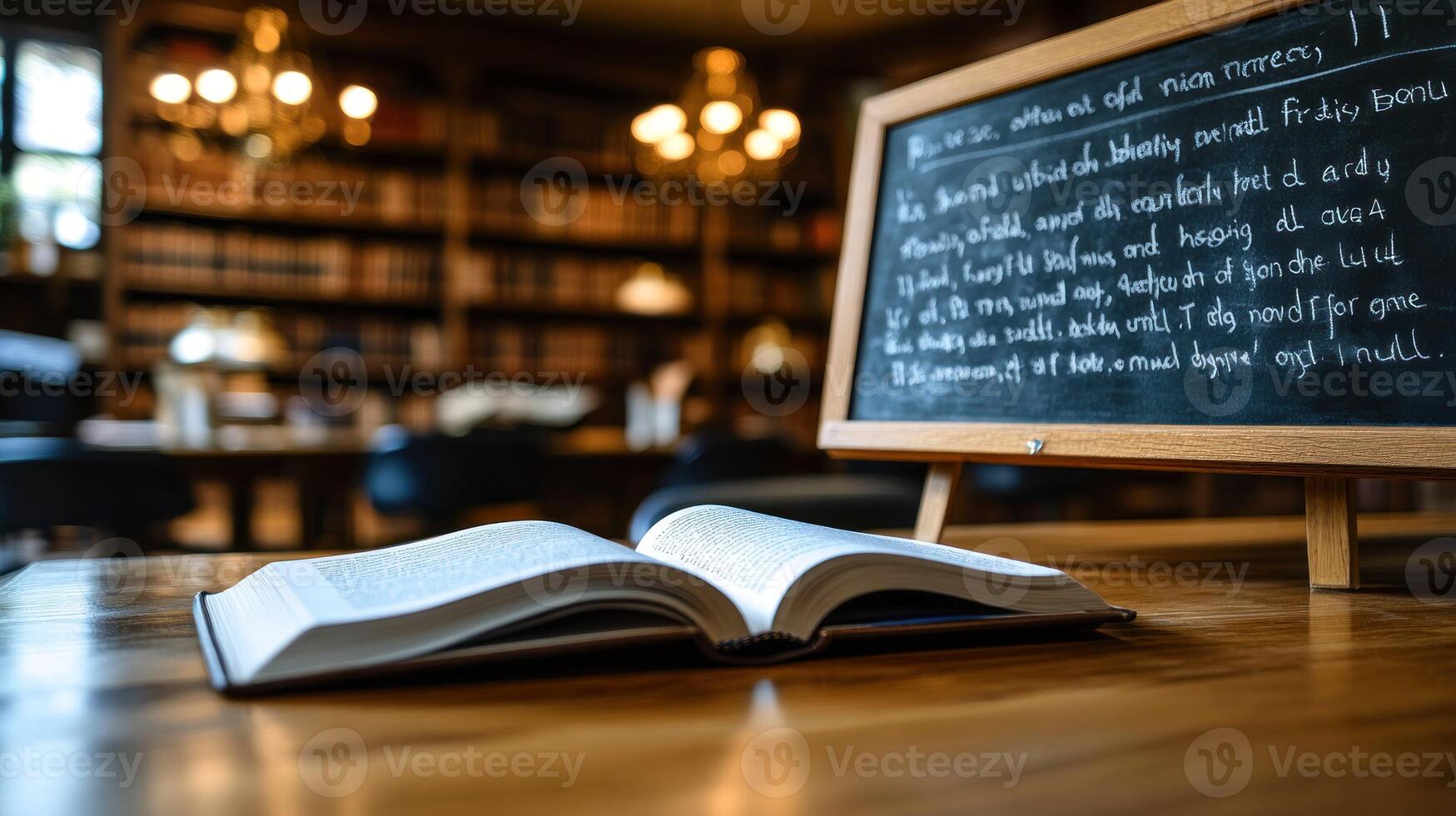 An open book on a table in a library Pro Photo