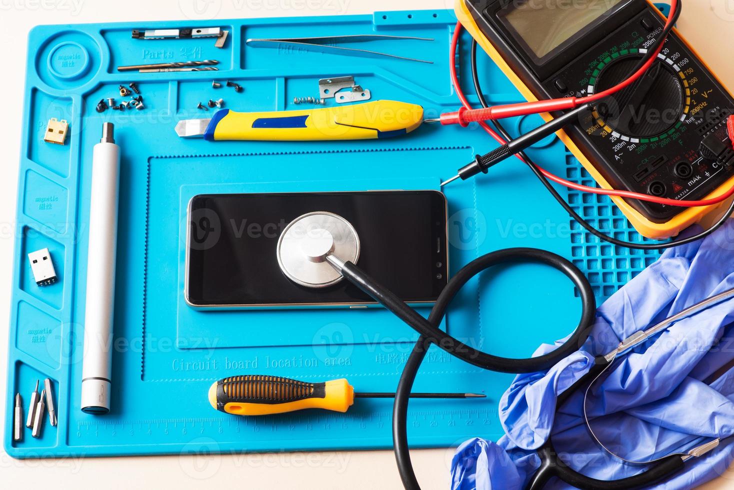 Flat lay image of dismantling the broken smart phone for preparing to repair or replace some components, Top view Pro Photo