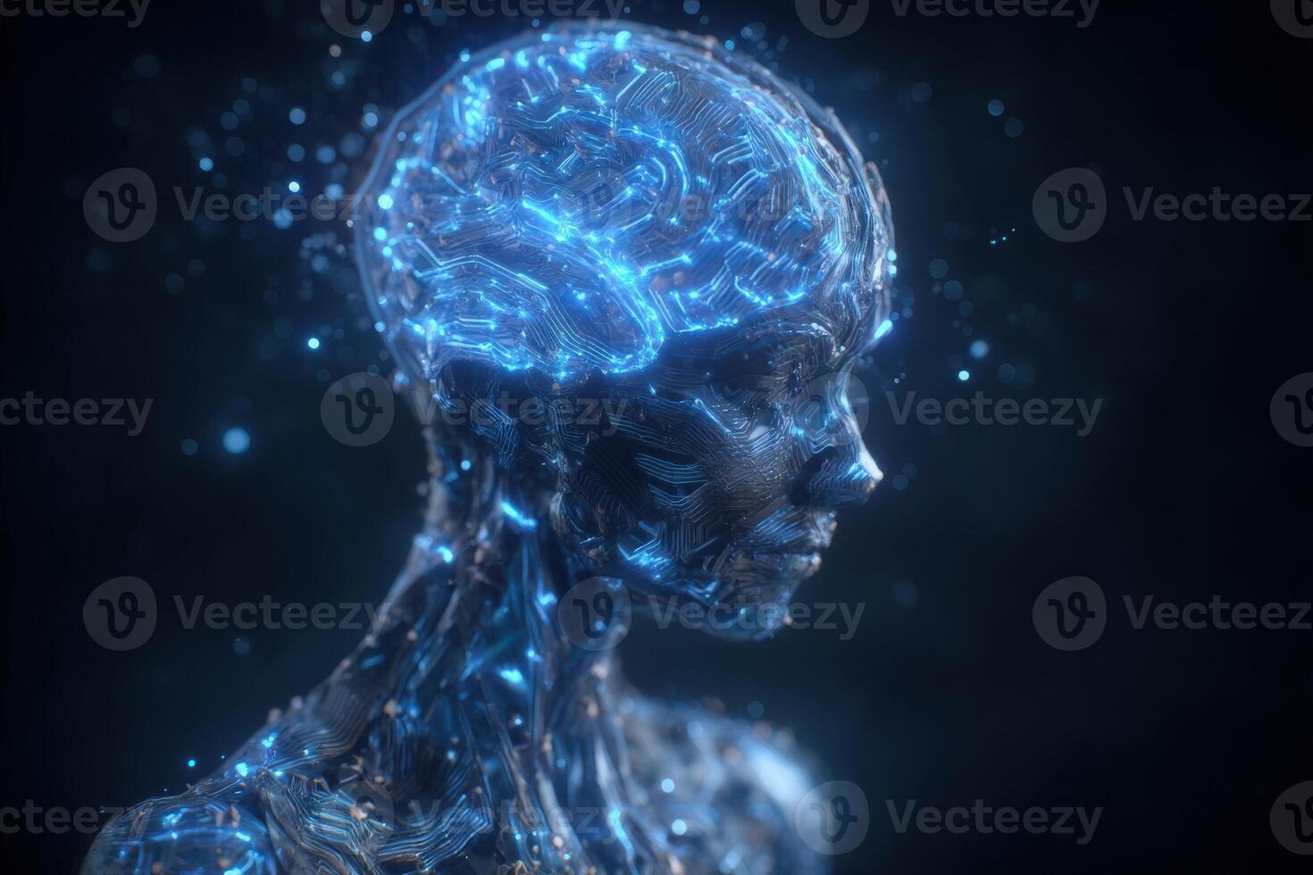 A detailed depiction of a transparent human head filled with luminous circuitry, representing a brain. The glowing elements create a captivating visual effect against a dark background. Pro Photo