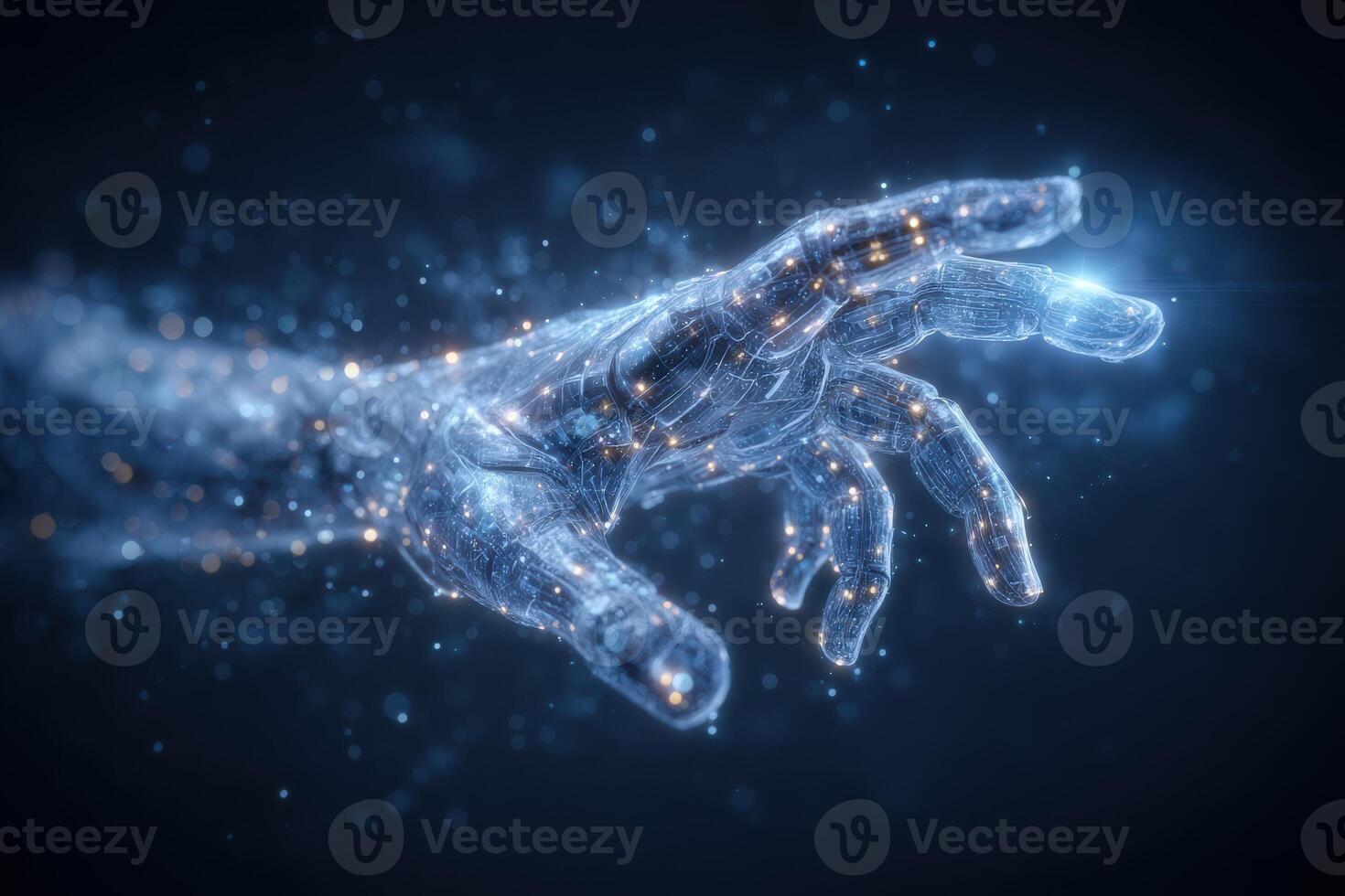 A holographic hand extends into a dark space, illuminated by glowing lines and shimmering particles. This digital representation evokes a sense of advanced technology and connection. Pro Photo