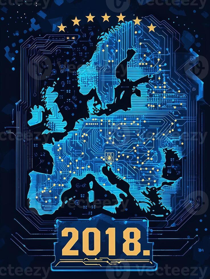 Map of Europe designed with a circuit board style, highlighting connections and networks. The year 2018 is prominently displayed at the bottom, emphasizing technological advancements. Pro Photo