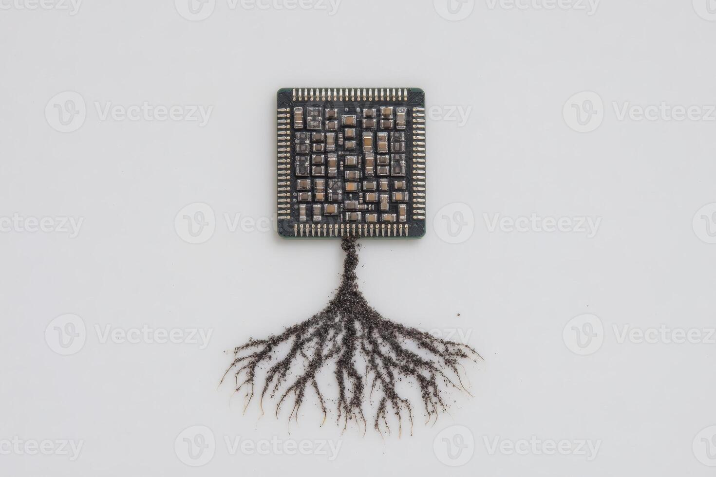 A detailed view of a microchip with intricate circuits at the top, while dark, root-like formations extend downward. This representation blends technology with organic elements in a unique way. Pro Photo
