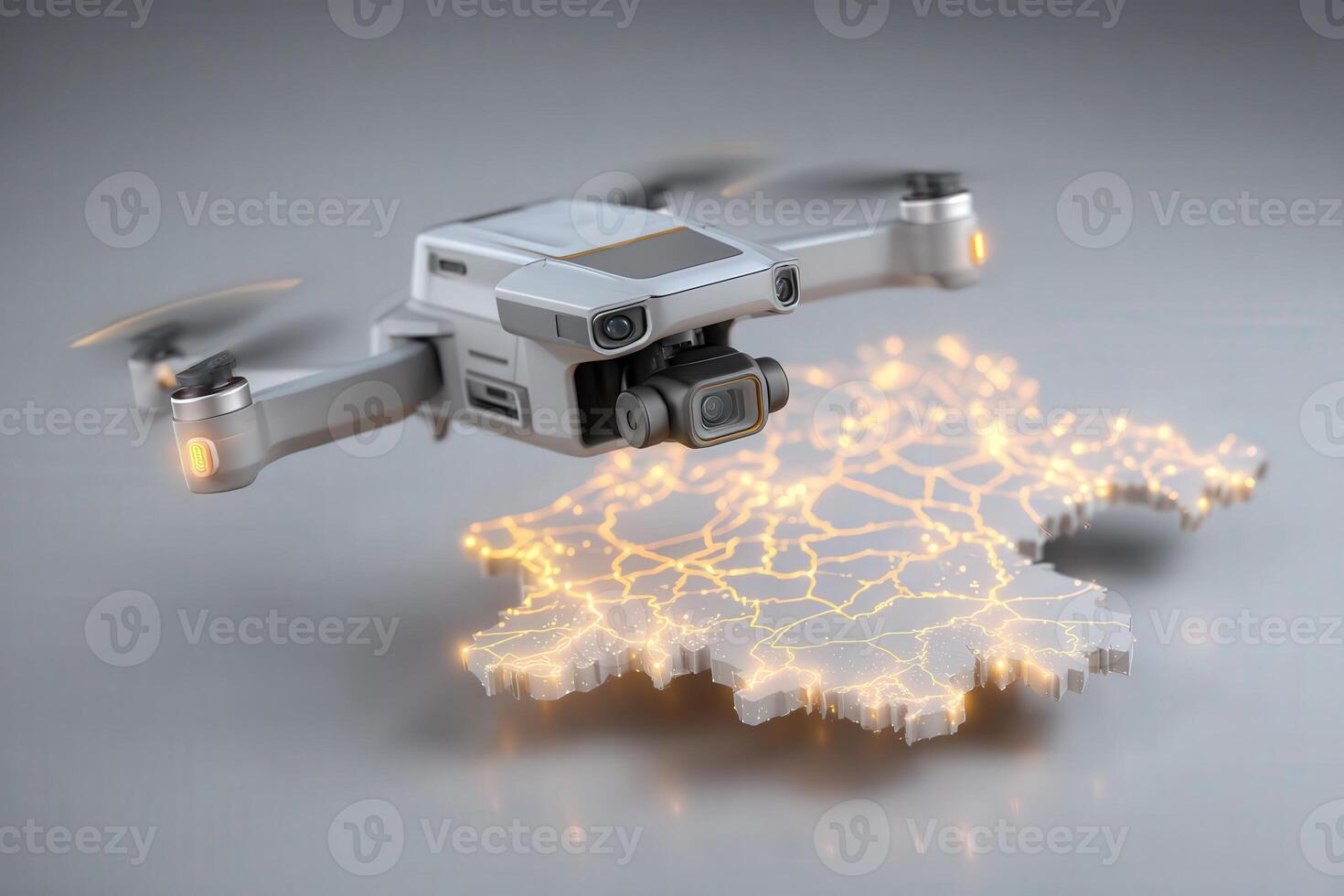 A drone equipped with a dual camera system hovers above a stylized map surface displaying intricate terrain features. The scene highlights the merging of technology and mapping. Pro Photo