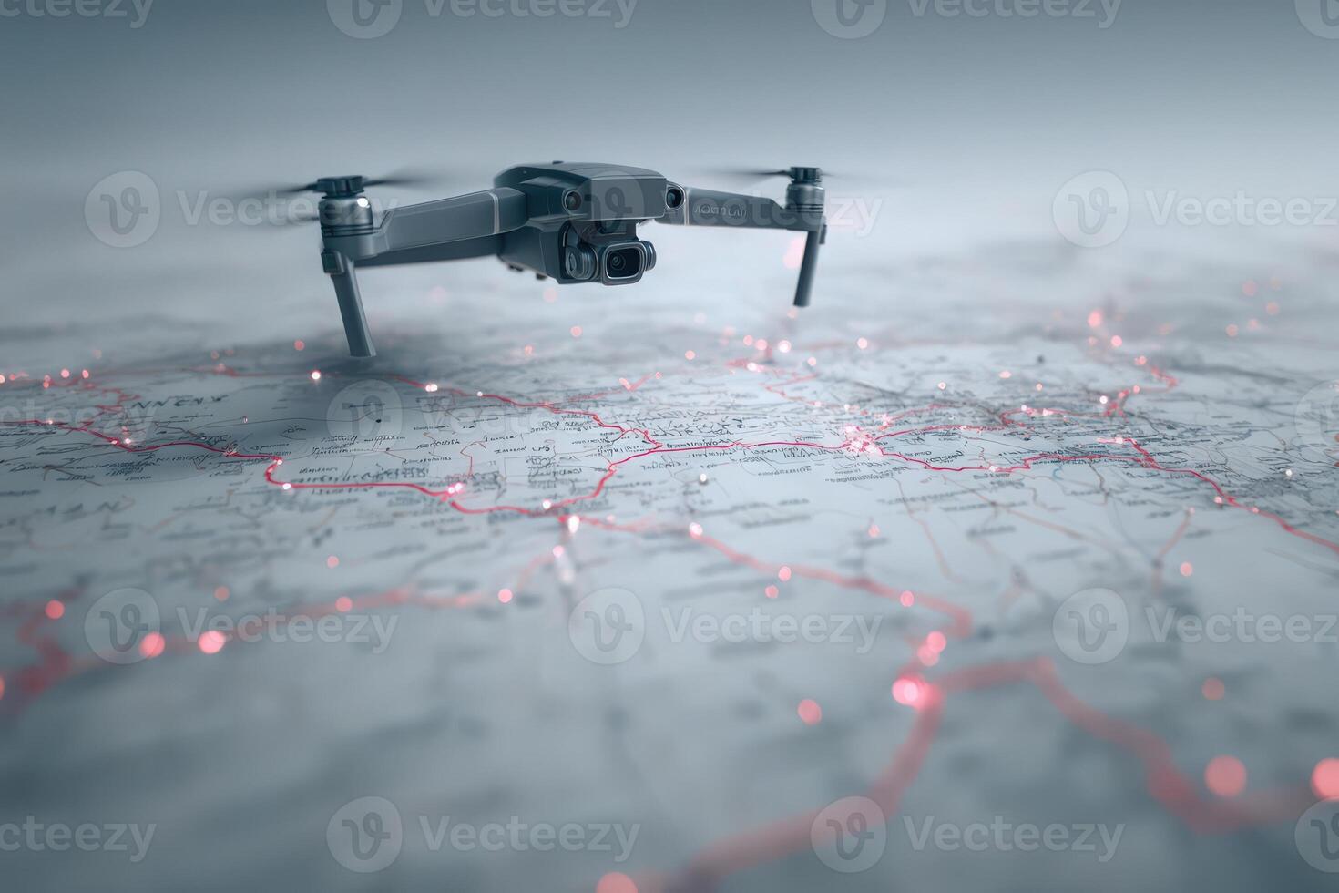 A drone hovers above a map, showcasing intricate routes highlighted in glowing red. The setting is serene, emphasizing the contrast between technology and geographic exploration. Pro Photo