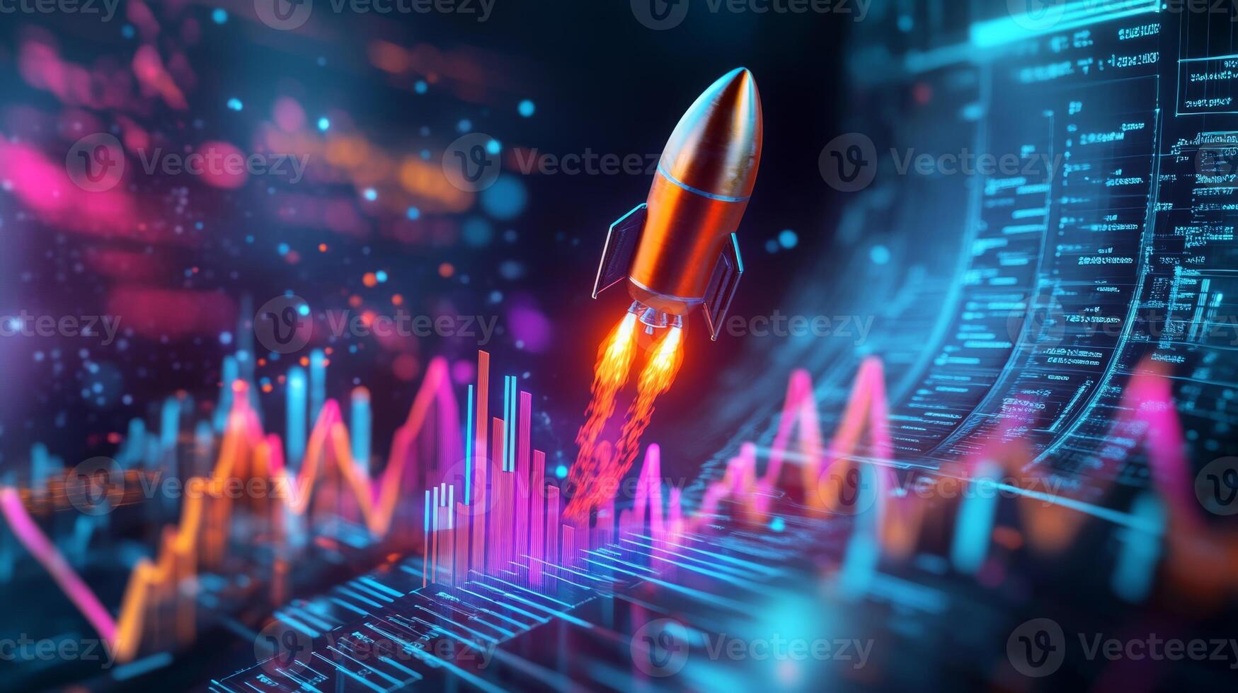 Rocket launch symbolizes growth and progress with vibrant data visuals amidst futuristic graphs in a digital landscape Pro Photo
