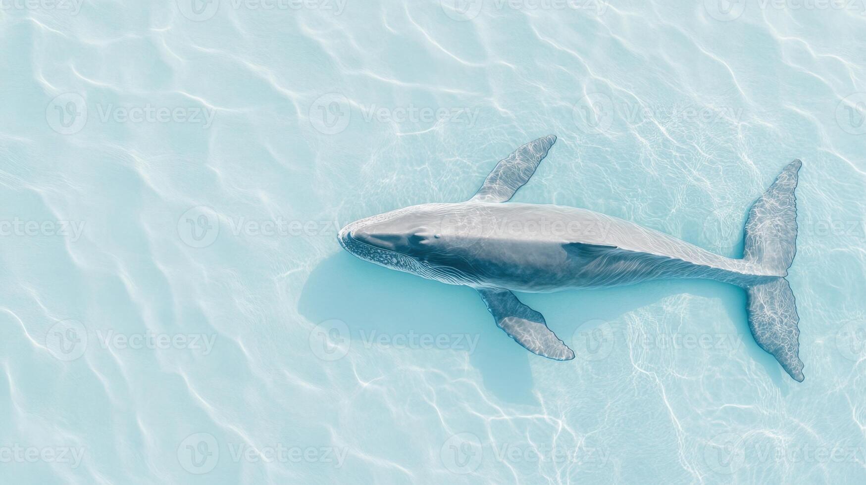 Whale swims in shallow clear ocean water. Light reflects and creates patterns on sea floor. Calm ocean surface visible from above Pro Photo