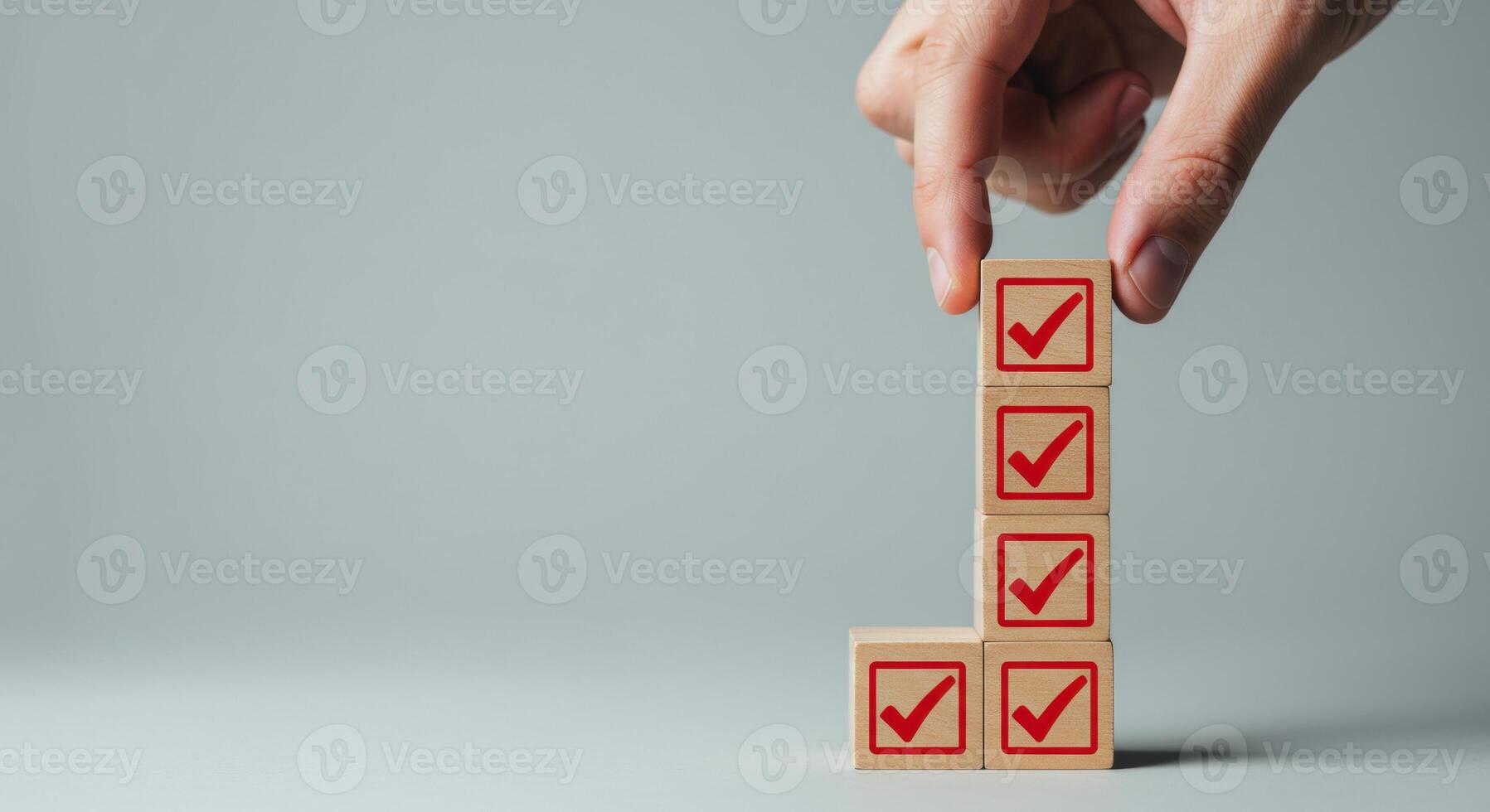 Hand placing checkmark block on stack representing completion and success Pro Photo