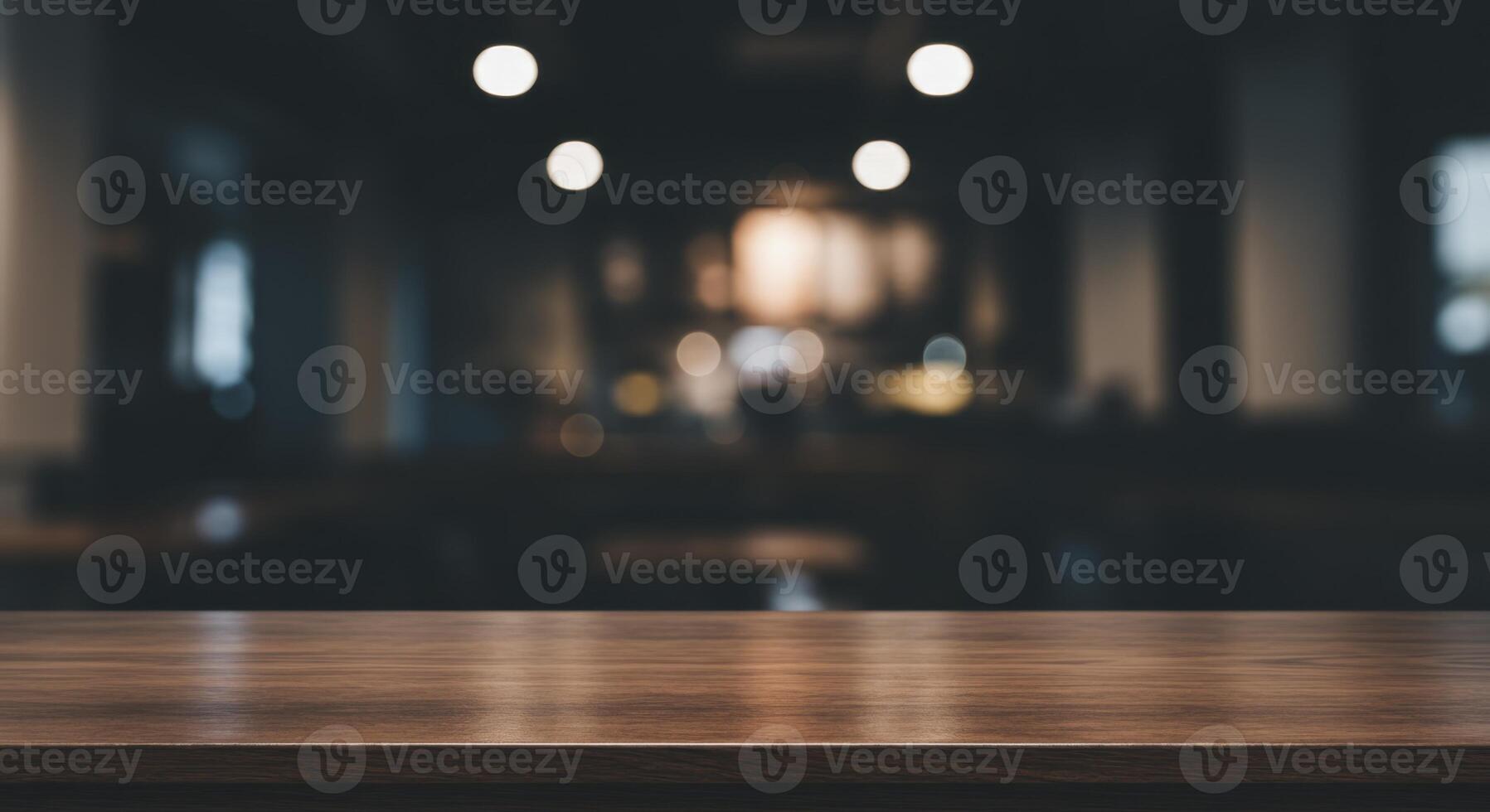 Empty Wooden Table Top With Blurred Cafe Background And Bokeh Lights Pro Photo