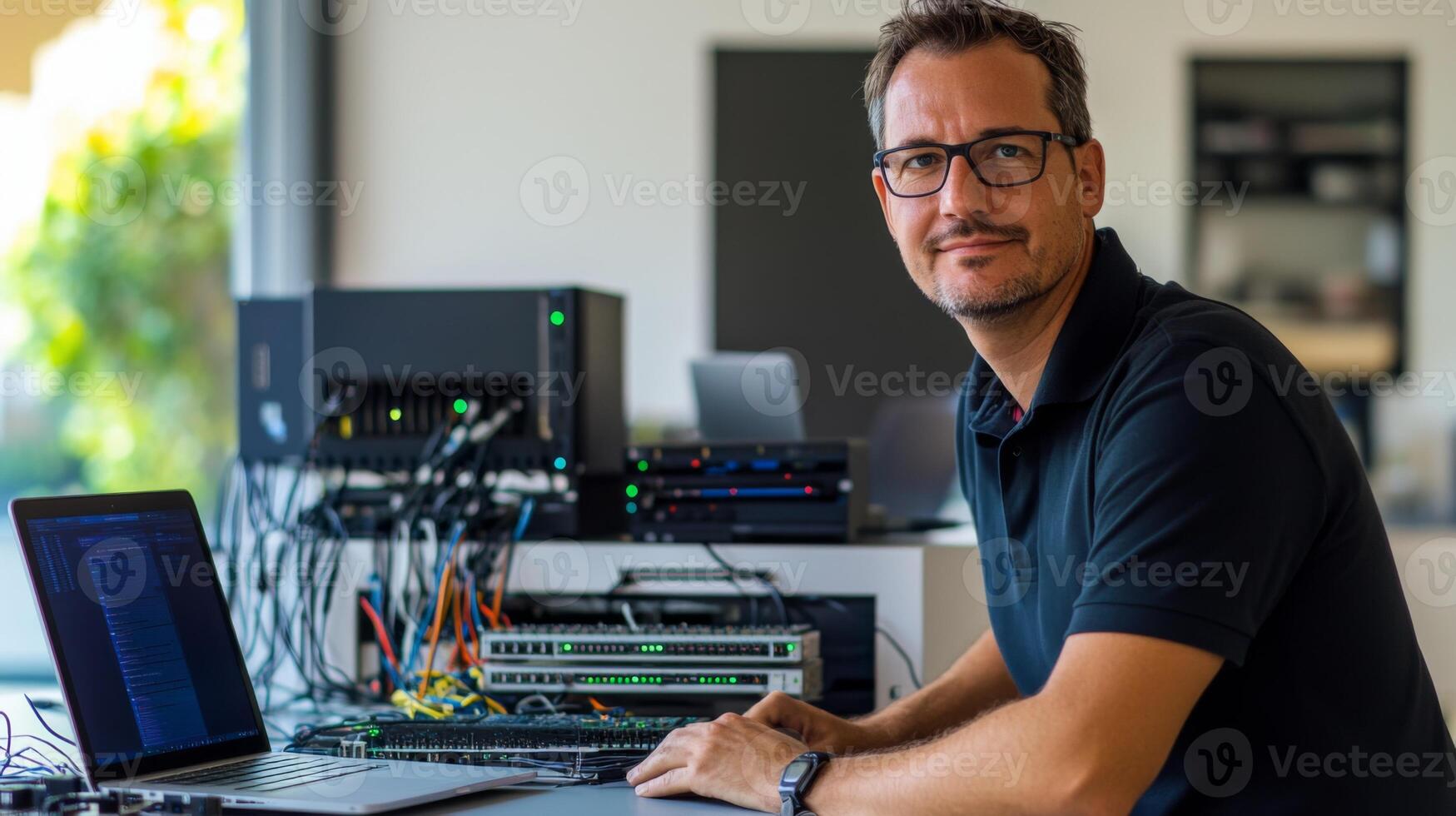 Man in Glasses Working on a Computer with Server Equipment in the Background Pro Photo