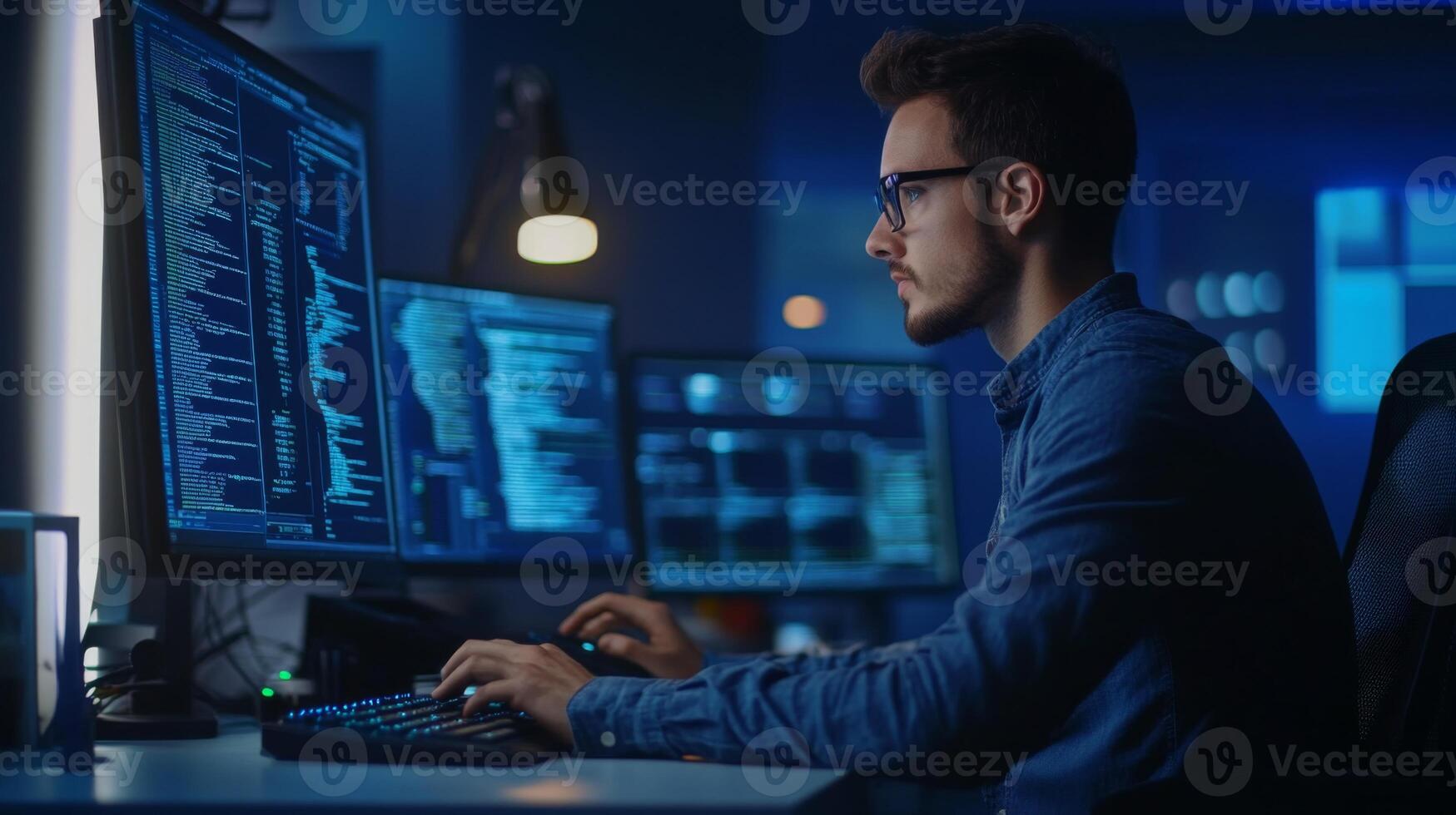 Young Man Working on Computer with Code Displayed on Screen Pro Photo