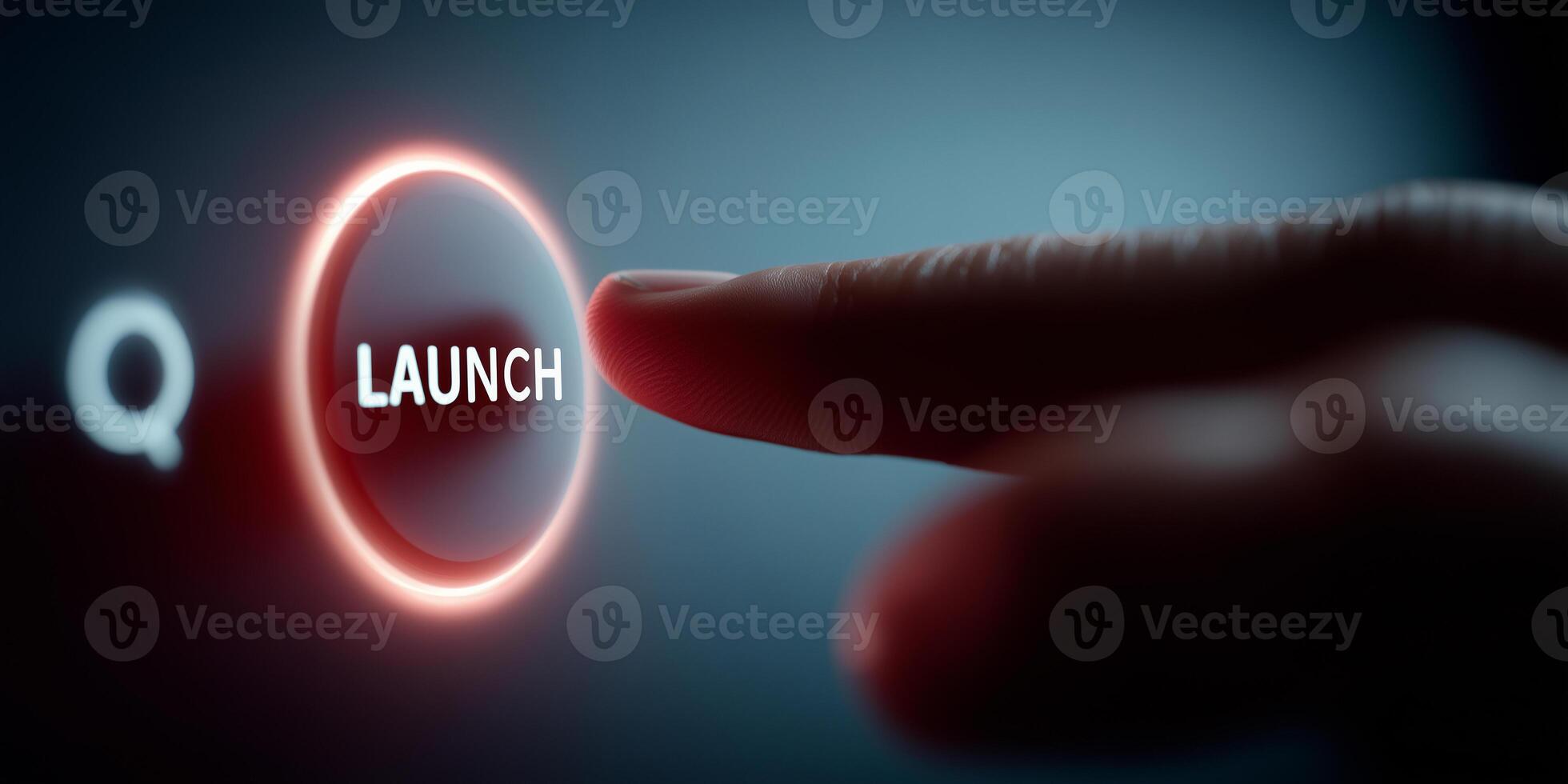 Hand pressing a glowing launch button on a digital interface emphasizing privacy and security Pro Photo