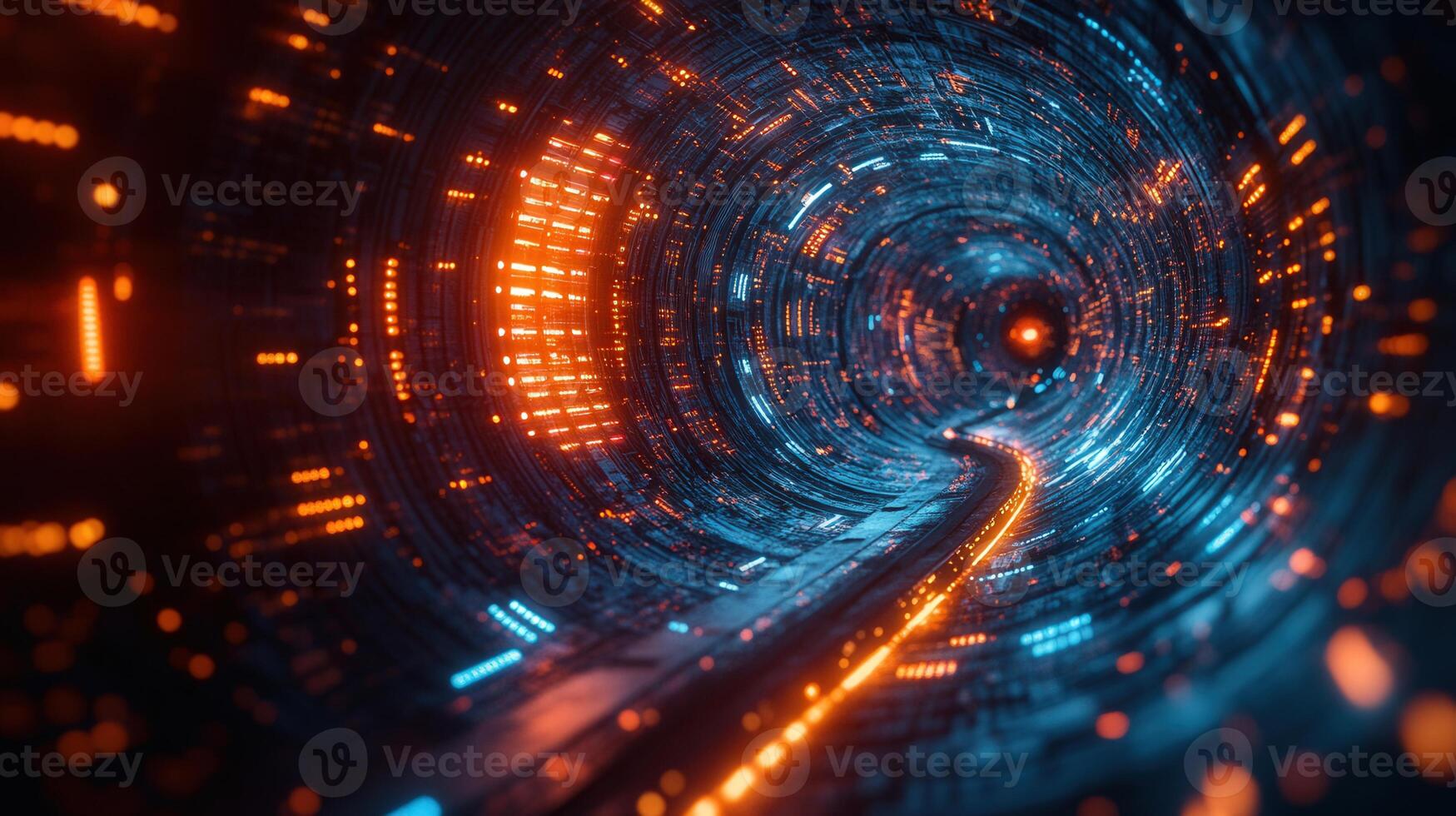 A dynamic, futuristic tunnel with glowing orange and blue lights, representing data flow. Pro Photo
