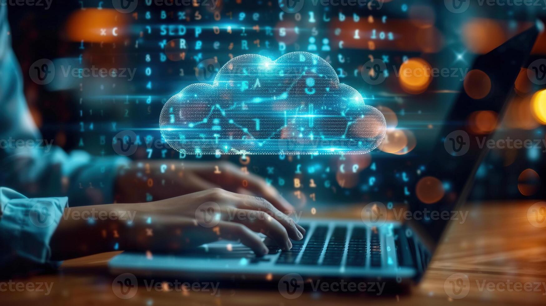 A person works on a laptop with a digital cloud graphic, representing cloud computing. Pro Photo