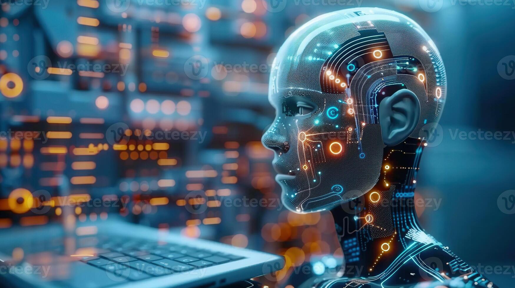 A futuristic ai robot with circuits is looking at a laptop, representing the future of technology. Pro Photo
