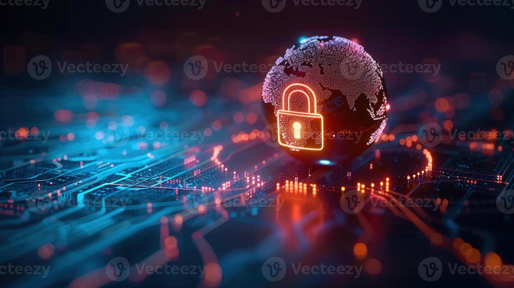 An illuminated lock hovers above the globe, representing data protection and cybersecurity. Pro Photo
