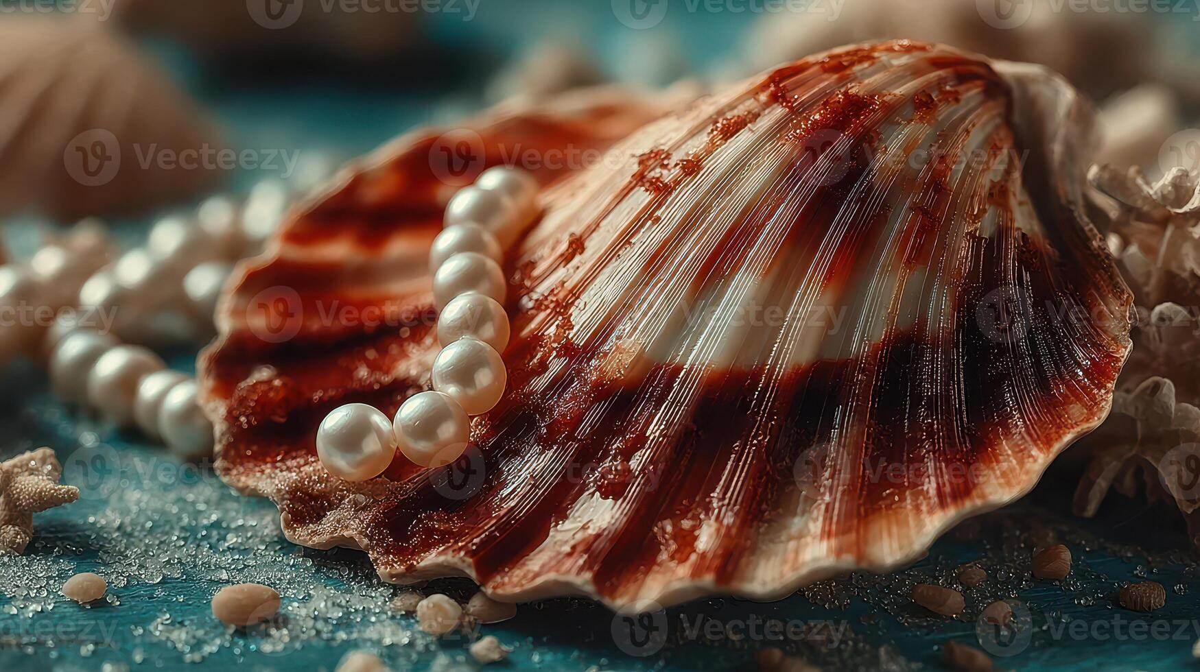 Pearl resting on a beautifully patterned scallop shell with a backdrop of sand and other shells at sunset on a beach Pro Photo