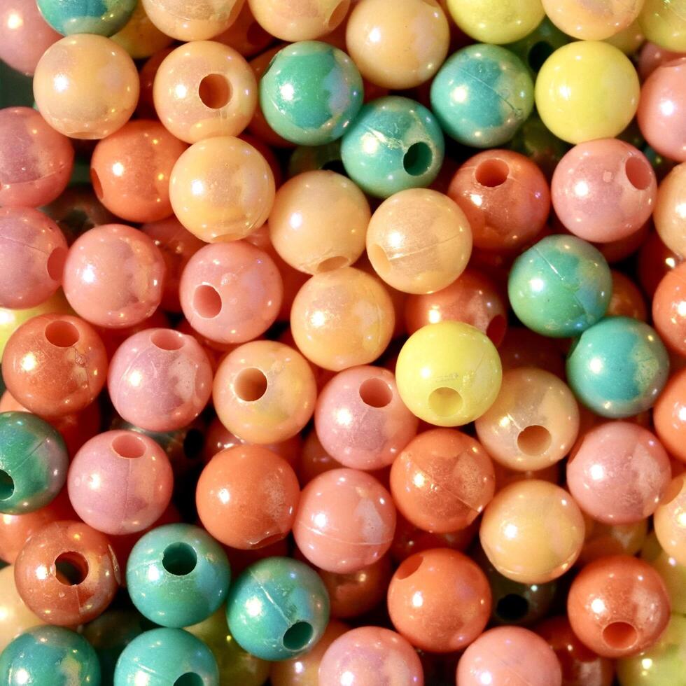 Close up colorful round beads diy craft objects isolated on square full frame background from top angle view. photo