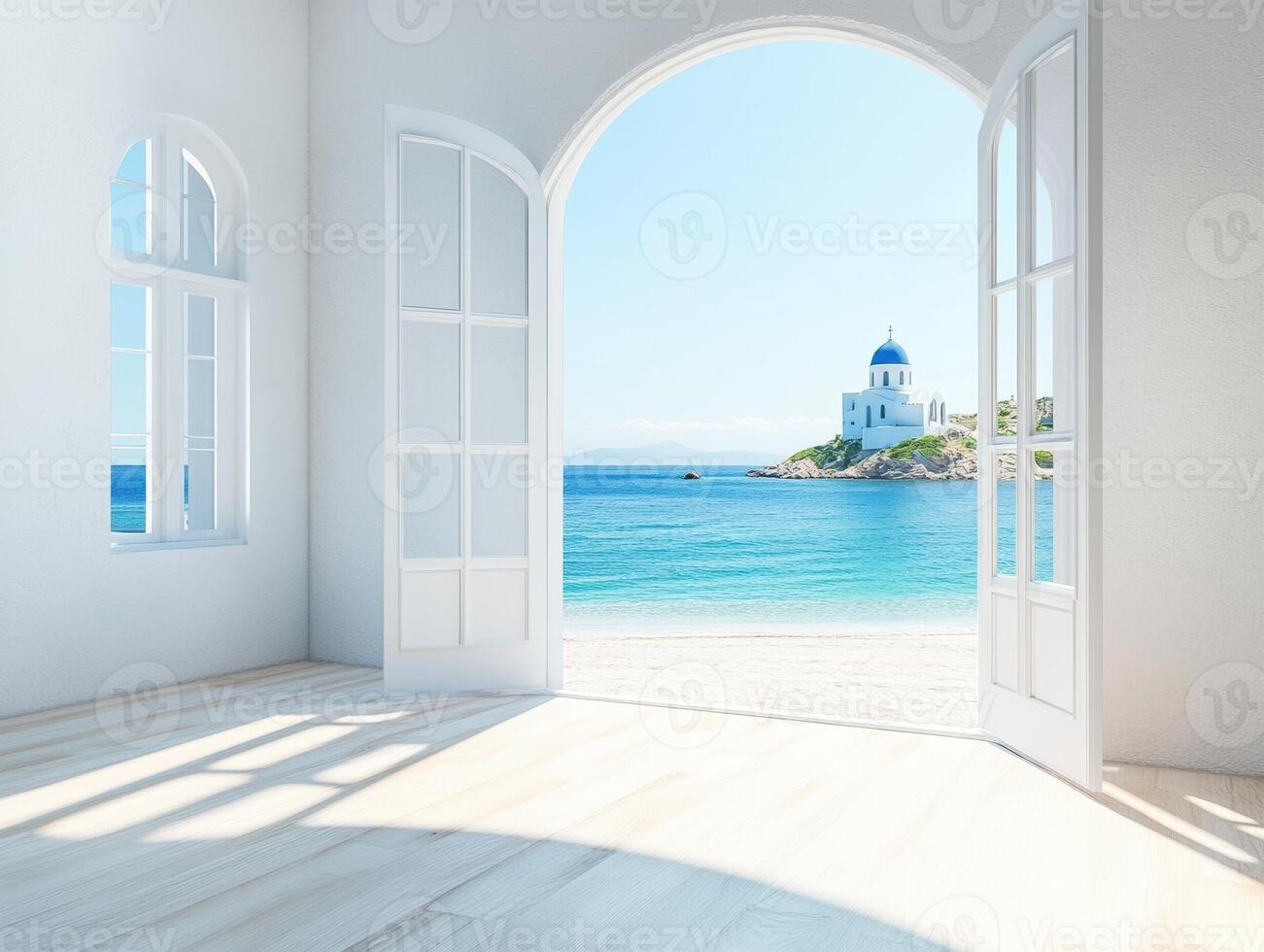 Serene beachfront view of greek island with whitewashed architecture Pro Photo