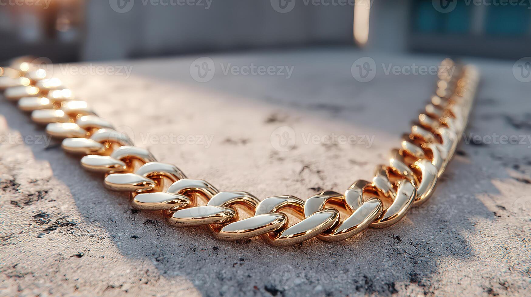Stylish close-up of a gold chain resting on a concrete surface during sunset, highlighting intricate links and reflections in warm light Pro Photo