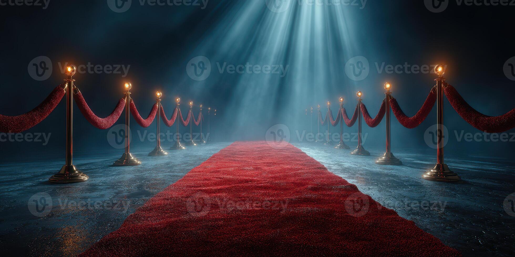 Entrance to a prestigious event illuminated by soft lights and lined with red carpet and velvet ropes Pro Photo