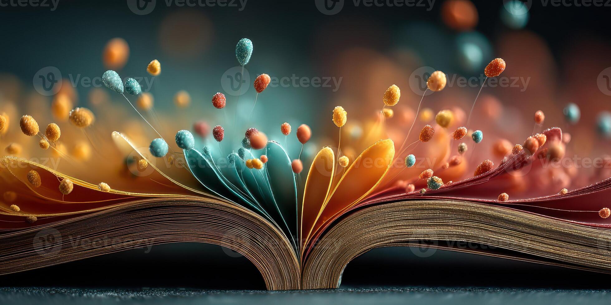Creative book with colorful pages and vibrant particles emerging in a surreal setting during evening light Pro Photo