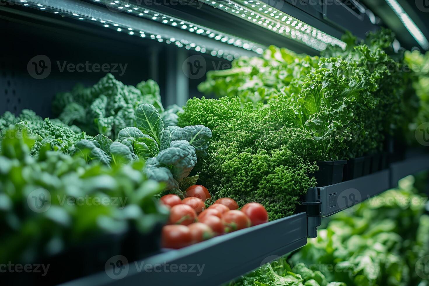 a futuristic vertical farm with automated systems growing vegetables in stacked layers, vibrant lighting emphasizing the greens and clean design Pro Photo