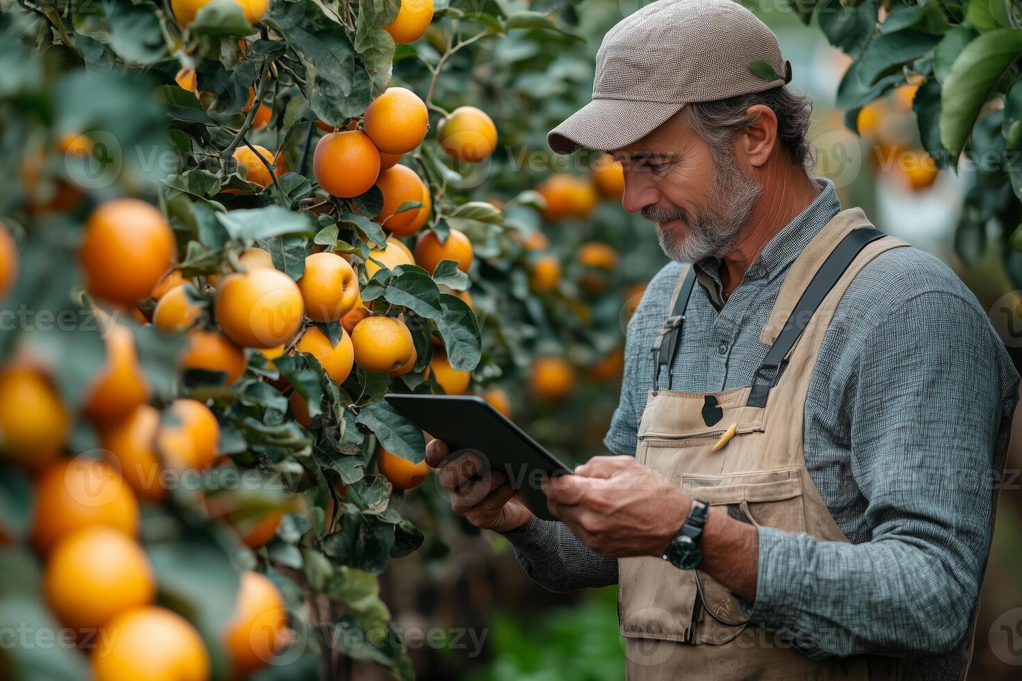 IoT sensors attached to fruit trees in an orchard, capturing humidity and growth data, farmer inspecting the trees with a digital tablet, sunny and vibrant outdoor setting Pro Photo