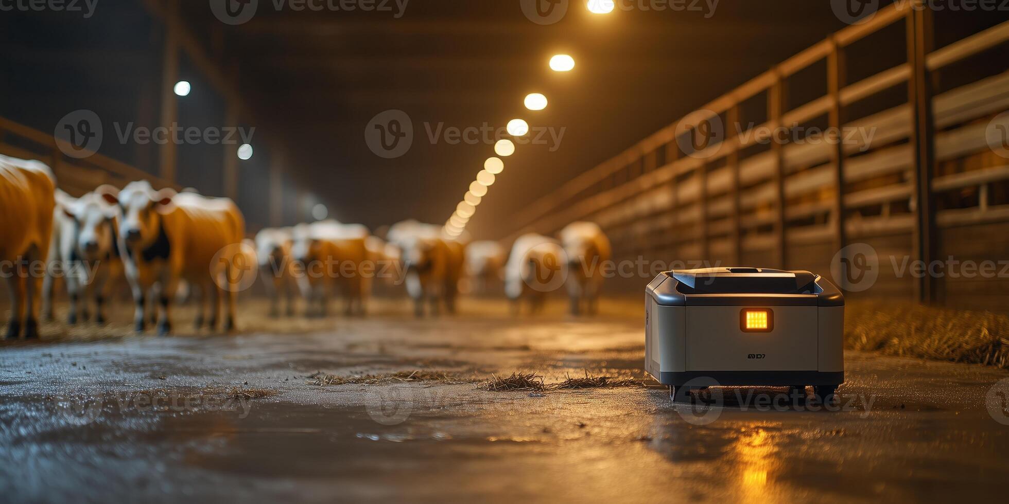 an automated cleaning robot moving through a robotic barn, cows grazing in the background, modern machinery visible Pro Photo