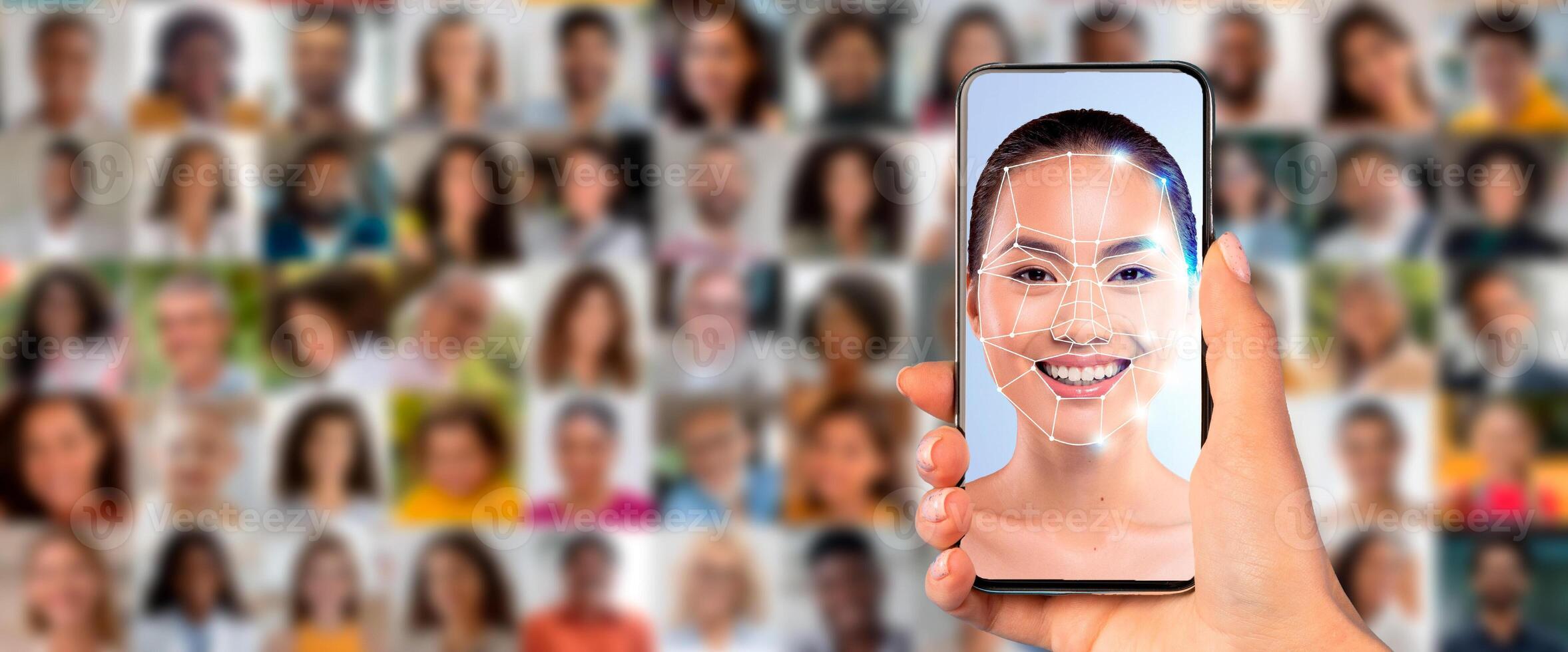 A hand holds a smartphone displaying a facial recognition scan of a person. Behind are various portraits of individuals, showcasing the technology's capabilities in identifying faces. Pro Photo