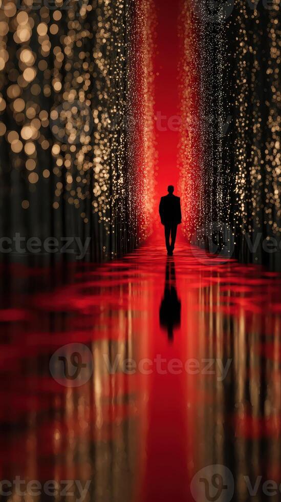 Mysterious figure walks through illuminated pathway in theatrical setting with red hues and shimmering lights Pro Photo