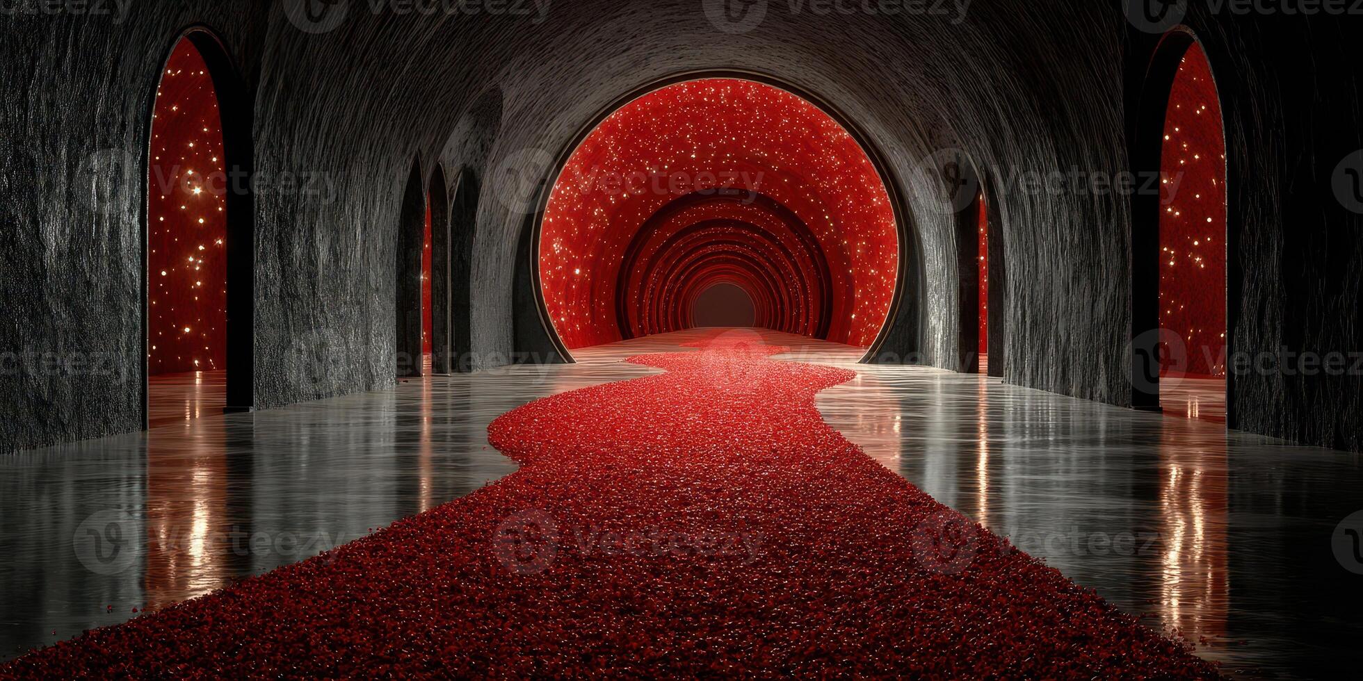 Red pathway flows through modern archway leading to starry bright backdrop in a unique architectural space Pro Photo